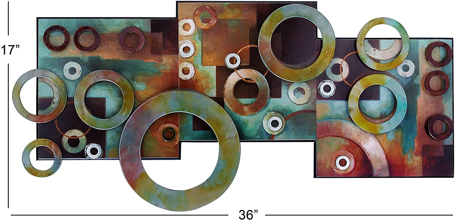 36 inch contemporary brown and turquoise multi geometric ring wall art montage, three square painted wooden panels behind painted floating iron rings. This product is manufactured in China.