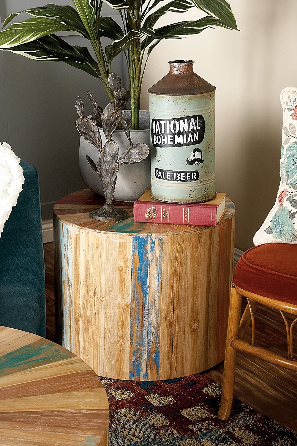 Item description: item description: 18" rustic organic round side table in natural reclaimed wood with textured paneled details.