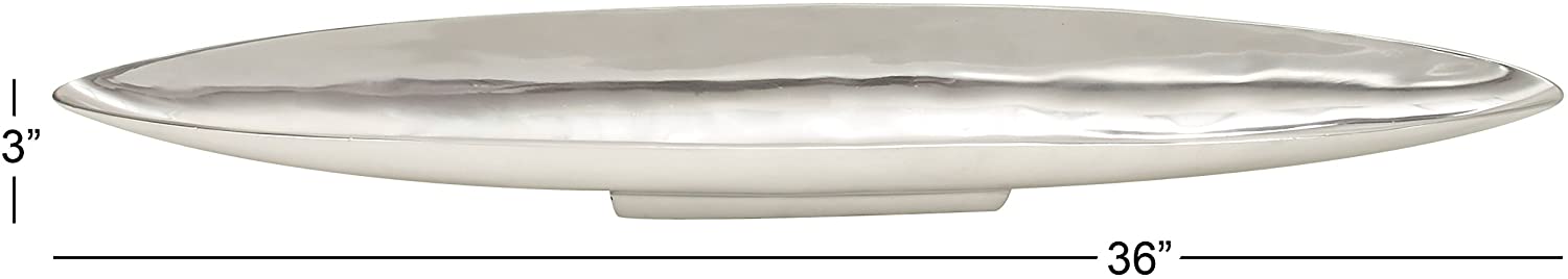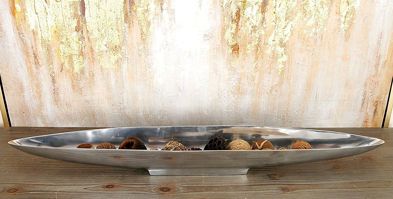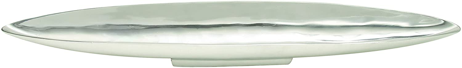 36 inch modern reflections aluminum canoe-shape bowled tray, polished silver finish, long Boat-Shape tray with lip ends and block base.