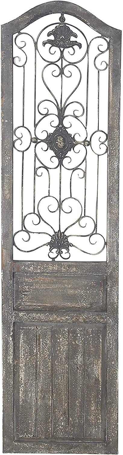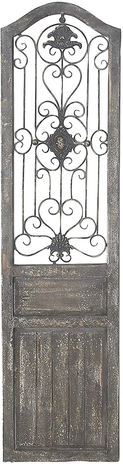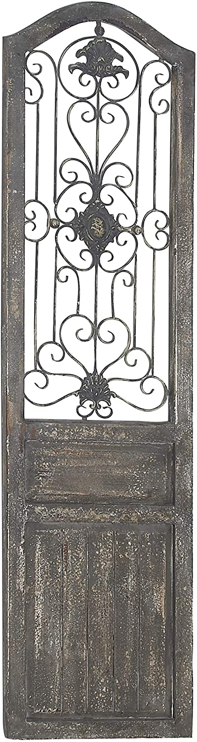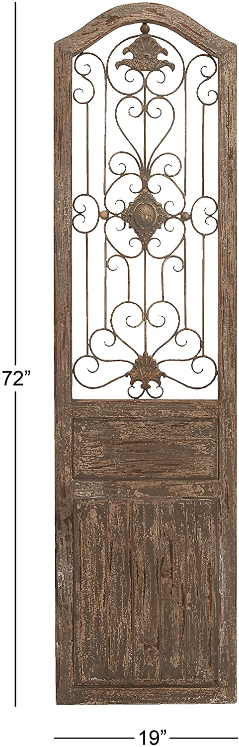 Important Features: _Made of wood and metal _Size: 19"x1"x72" This door is made with a unique garden gate styled floral center and scrolling ironwork that meanders out from it. The plaque is made into the shape of an old fairy tale style door, adding a beautiful and rustic quality anywhere you hang it. Ideally hung in a beautiful backyard garden or patio for a fairy tale escape.