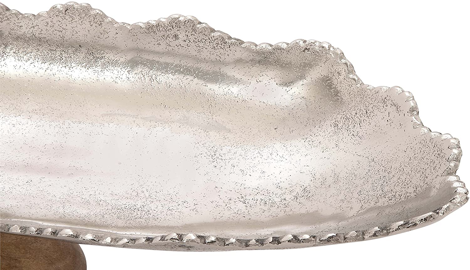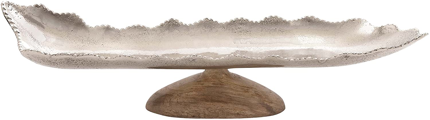 Add alluring touch to your interior by inclusion of this Boat Shape Alum Wood Dish. It will complement your house decor with innovative design. Elegant table accent, this decor is appropriate for decoration and usage. This beautiful decor piece is an alum dish on wooden stand. This long boat shape dish has uneven edges and it's dyed in silver hues and has glossy finish to it. The stand on which this dish rest is wooden with smooth finish. This long shape dish wood stand is quality made and will last for long. You can simply place this on side table, center table, dinner table or mantel. Its long shape gives you chance to decorate it the way you like. Not just as decorative, this dish stand can be used to display sweets, cup cakes etc. If you want such unique dish, you must get it without delay!.