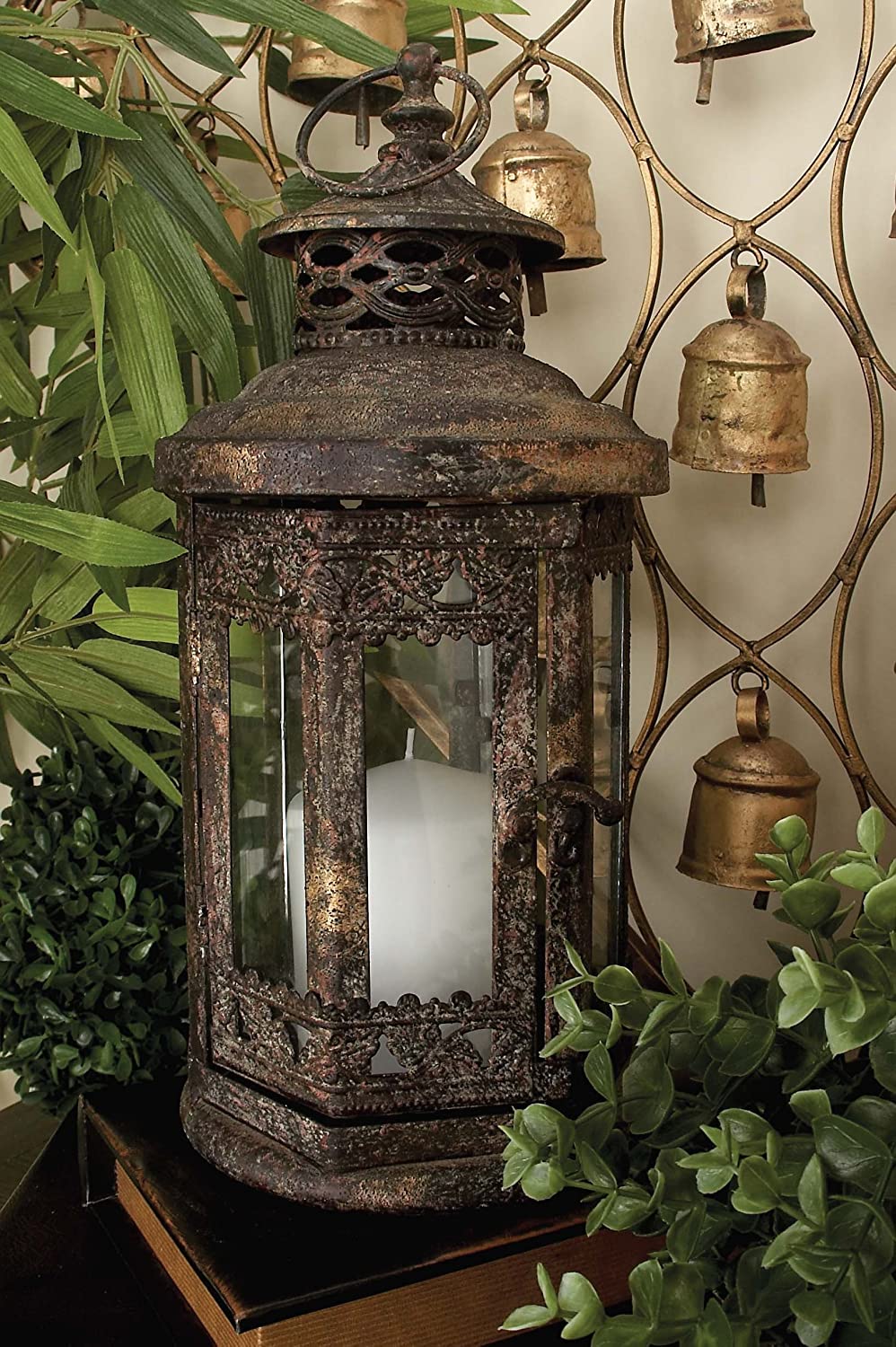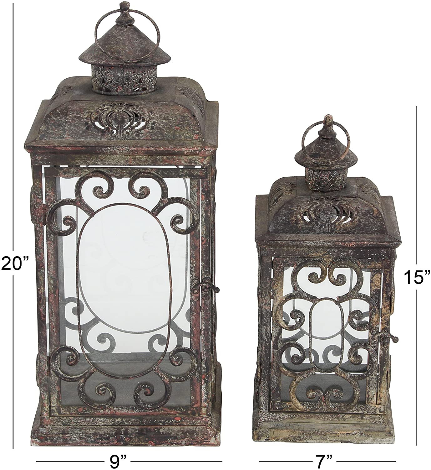 Set of two 20" and 15" updated traditional distressed bronze finish iron and glass square candle lanterns with scrollwork caging, punched metal bowed tops and cupolas, ring holders, platform bases.