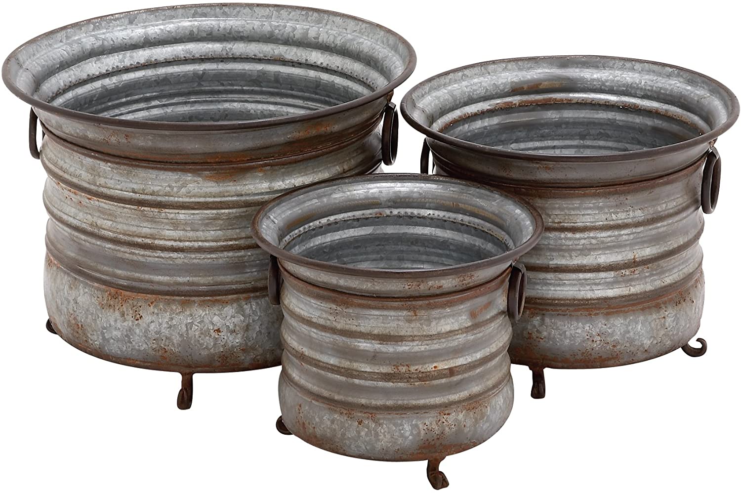 Set of three 20", 16" and 13" rustic distressed galvanized ribbed texture planters with flared openings, ring handles and curled feet.