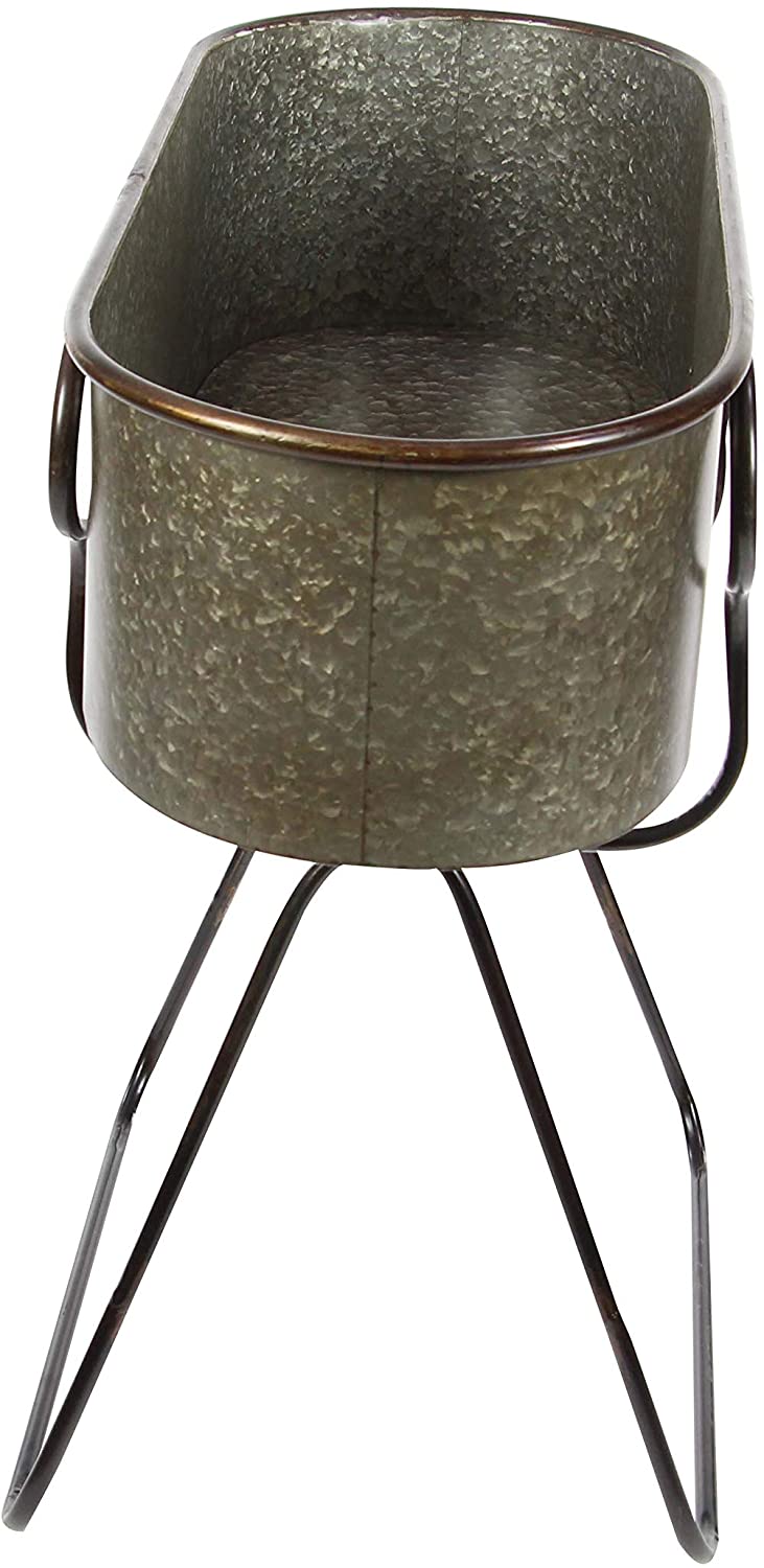 38" x 36" Farmhouse metal planter stand, oval tub-shaped iron planter with distressed gray aluminum finish, metallic black metal stand