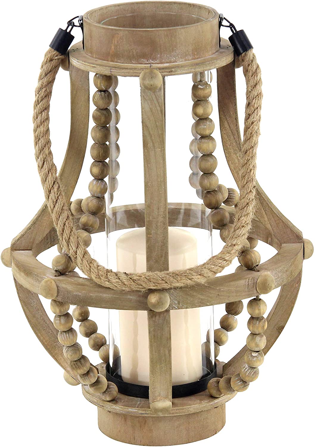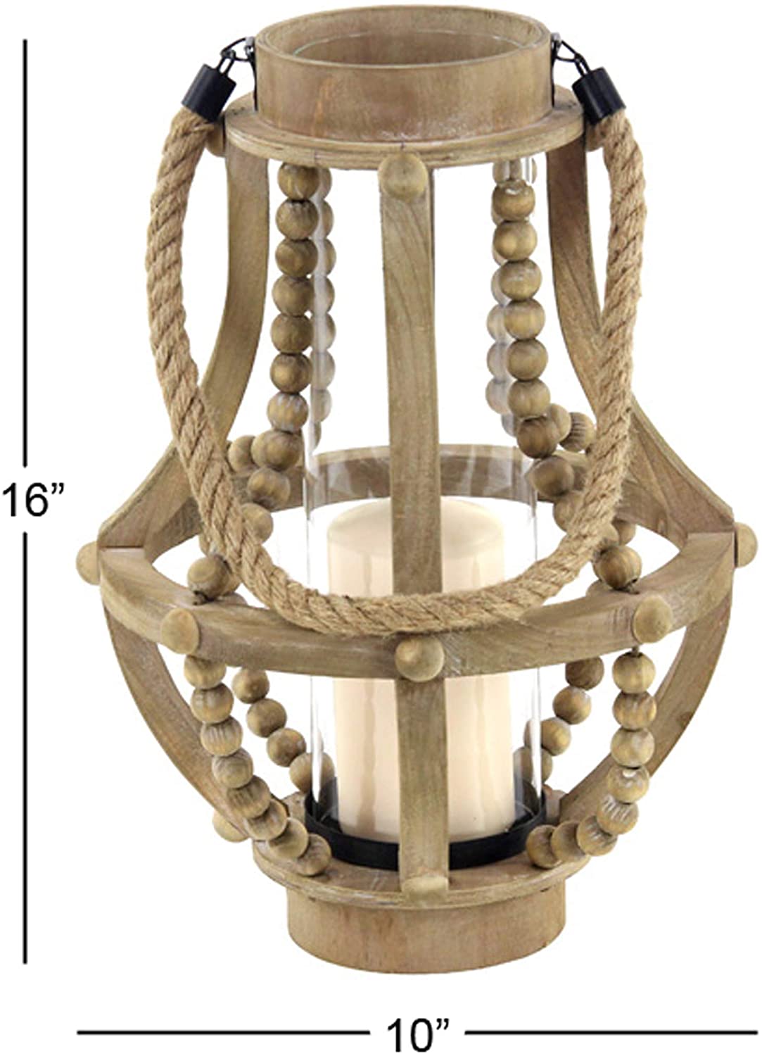 Add a touch of rustic charm to your mantel, console or shelf with the Deco 79 Rustic Brown Wood and Glass Candle Lantern, 16 x 10-Inch. This piece features a brown-finished open teardrop-shaped wooden frame designed with round bead patterns for added texture and dimension. The candle lantern also comes with a jute rope handle for added convenience, and a cylindrical clear glass container perfect for holding votive and pillar candles.
