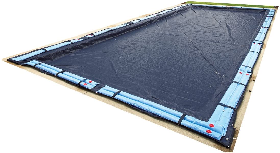 In-Ground Winter Cover with 8-Year Warranty. This Defender entry level cover has the strength and durability of covers costing twice as much. Rugged polyethylene scrim and coating means that this cover can withstand winters worst. Defender covers are U.V. protected so they will last for years in direct sunlight. The cover’s black underside retards algae growth and heat sealed seams means a crystal clear pool next spring. The Defender 8-Year cover comes with loops every four feet to secure water bags, and corner grommets allow for extra tie down in windy areas. The cover is 5 feet longer and wider than the pool size, and comes in a dark navy blue with a black underside. This Defender cover is backed by an 8 year warranty.
