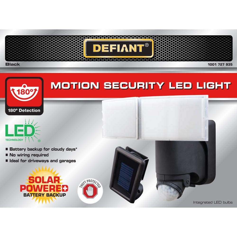 Enjoy the benefits of solar power technology with features like Battery Back Up technology, cord management, easy installation, and long last LED. The new Defiant Solar Powered LED motion security light contains new innovative Battery Backup Power technology. When fully charged by sunshine the fixture provides 600 Lumens of light. On the days when sunshine is not present and solar charging cannot take place, the Battery Back Up feature powers the fixture at 200 Lumens of light. Solar Powered Motion Lighting has no wiring required, which makes this light perfect for sheds or fences.