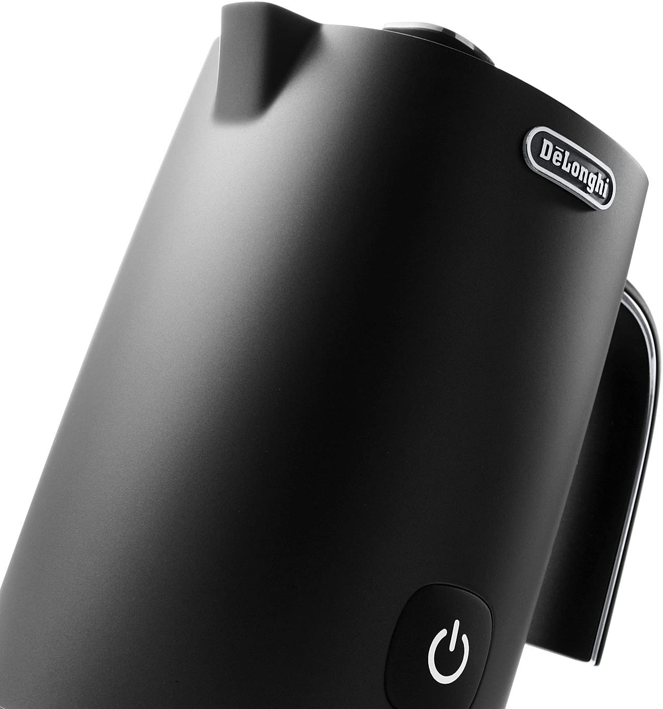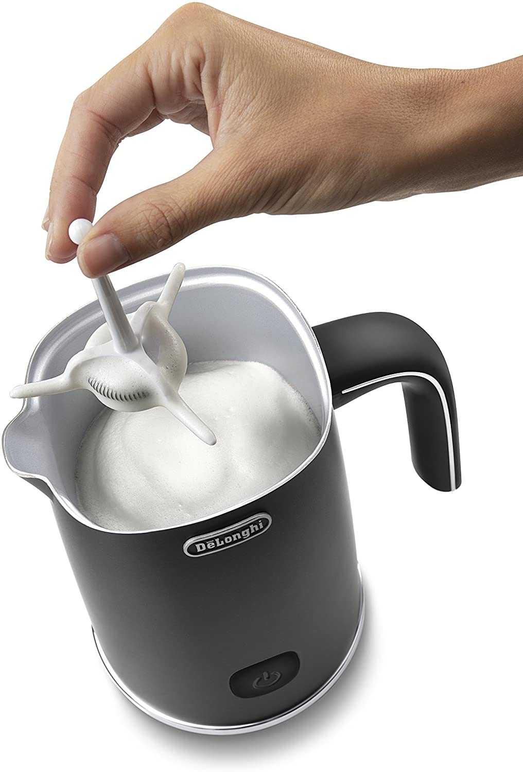 Froth creamy milk for both hot and cold drinks with this Delonghi milk frother. The black metal painted body has a nonstick coated pitcher for mess-free clean up. The handle, spout, and included lid make it easy to pour milk for your regular or iced cappuccinos and lattes. The milk frother comfortably rotates on a detachable power base. A removable drop-in whisk is also included for cleaning.