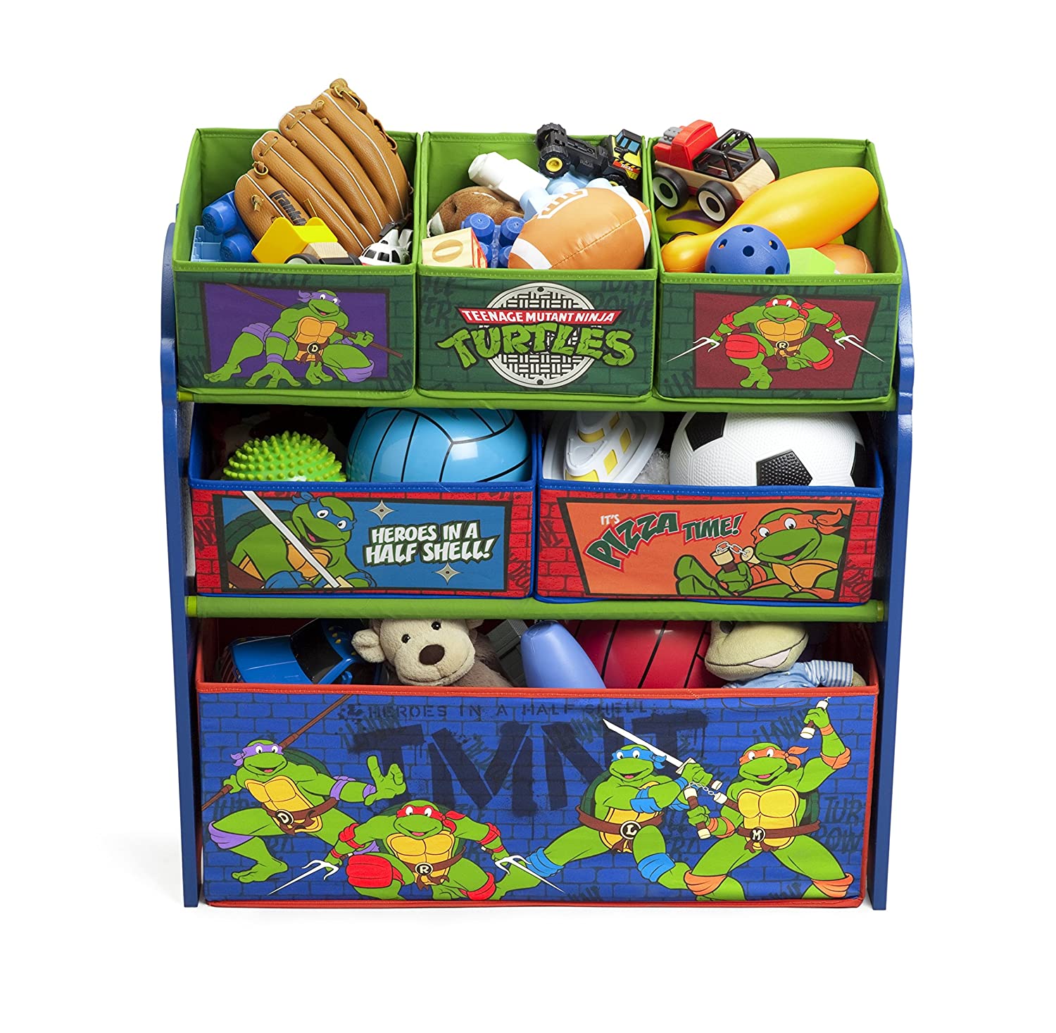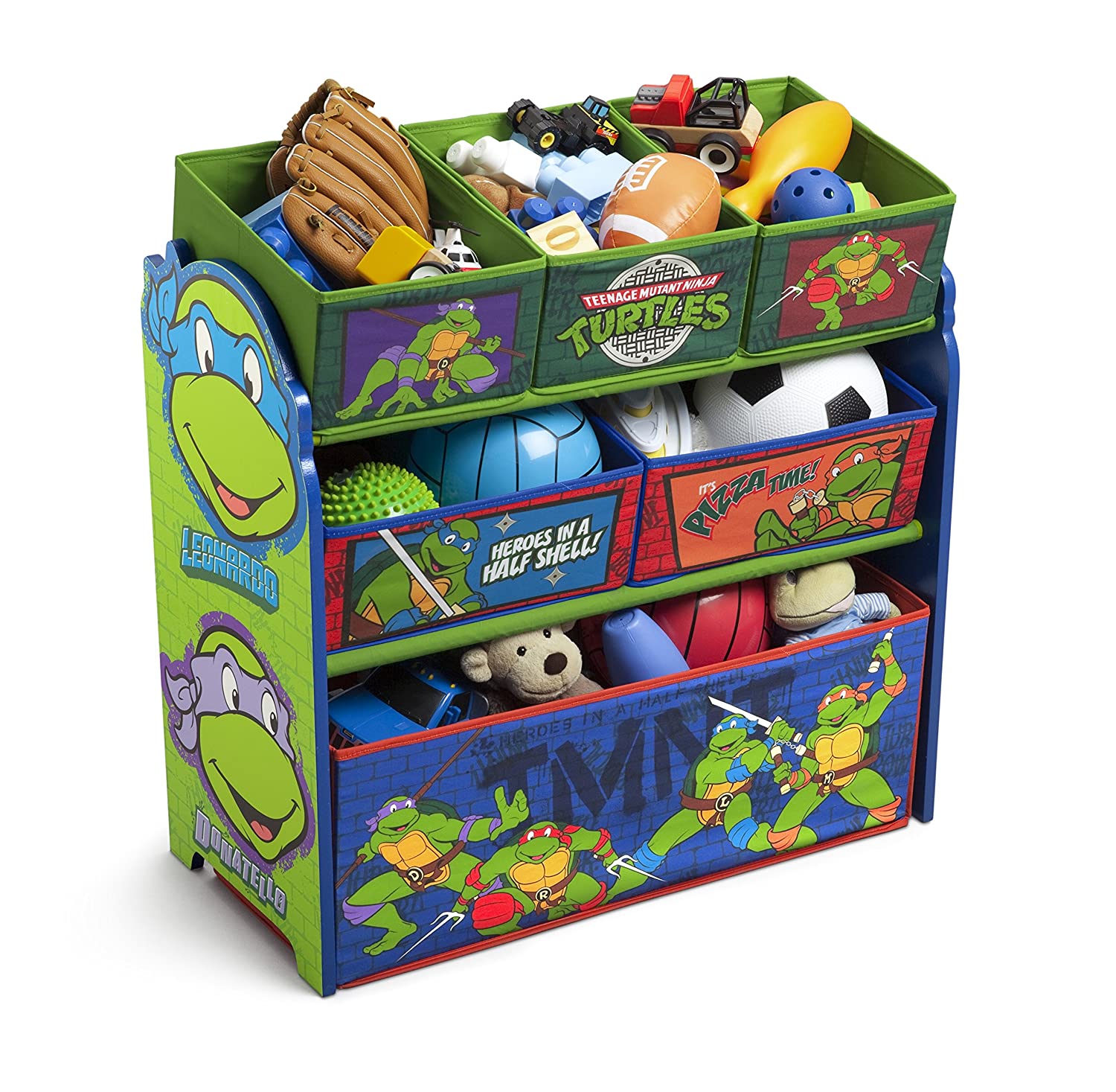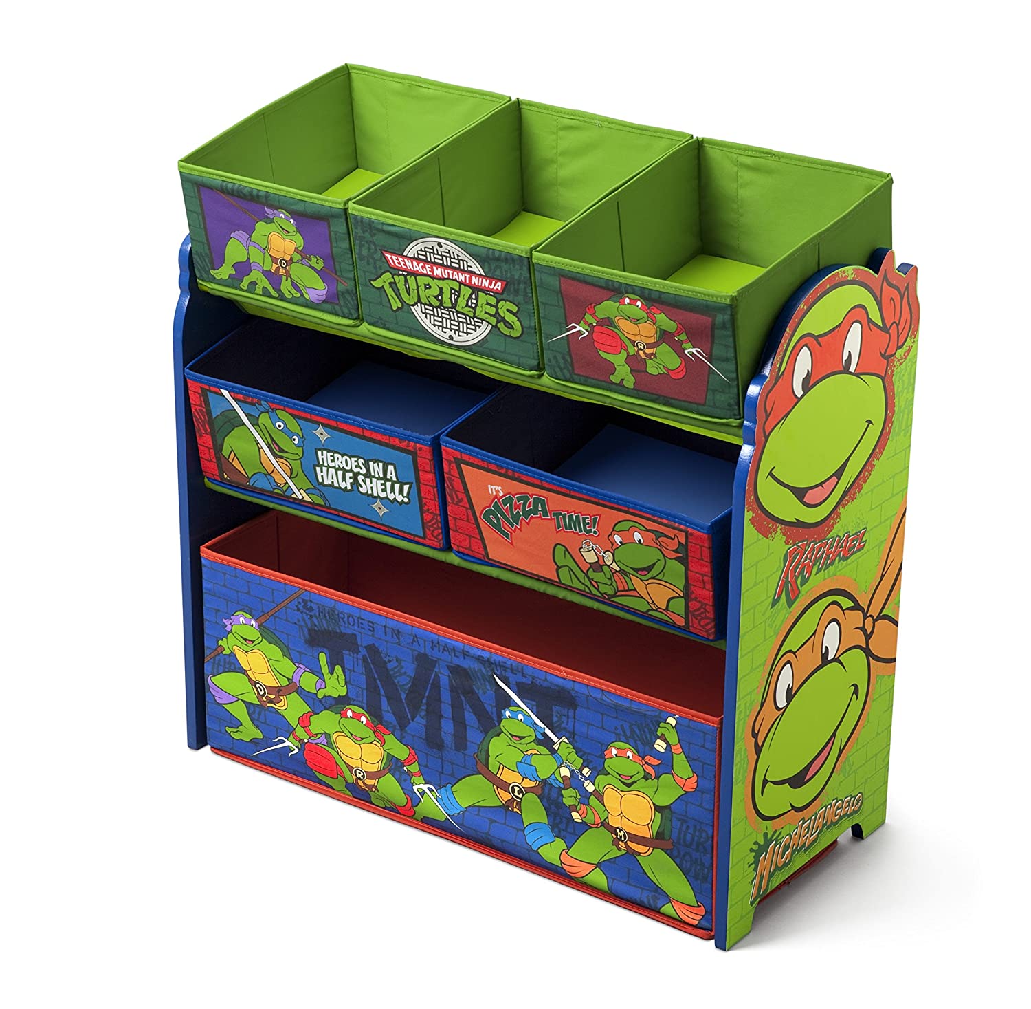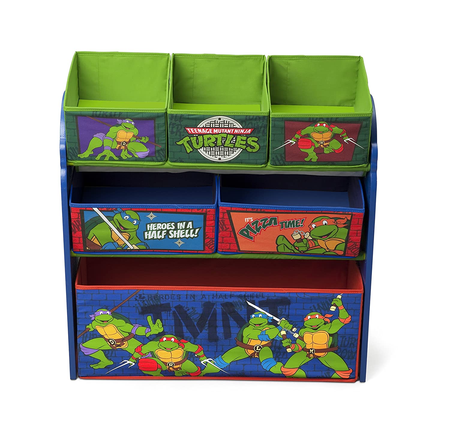 Morph a messy room into a clutter-free zone with this Ninja Turtles Multi-Bin Organizer from Delta Children! Featuring six uniquely sized fabric bins supported by a sturdy frame, it's finished with colorful illustrations of your boy's favorite turtles, Leonardo, Raphael, Donatello and Michelangelo. A fun option for easy organization of toys large and small, it encourages kids to clean up in record time.