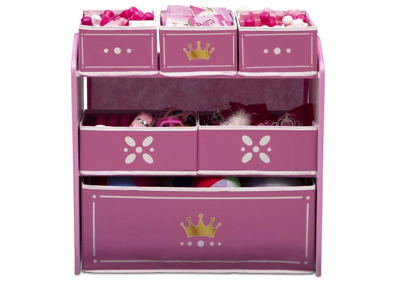 - PRINCESS THEMED PERFECTION: This Multi-Bin Toy Organizer features metallic gold crown emblems and pretty, pink trim