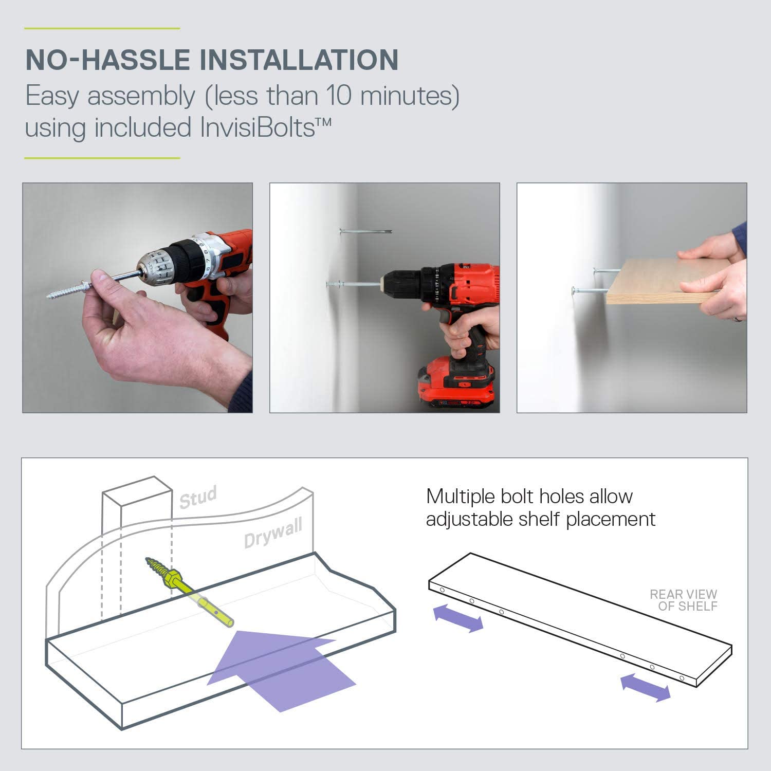 - ✅ NO-HASSLE INSTALLATION: Thanks to our proprietary Invisbolts, you can set up your wall-mounted floating shelf in under 10 minutes! No-show brackets enhance the minimalist aesthetic, while easy-to-follow directions ensure a frustration-free process.