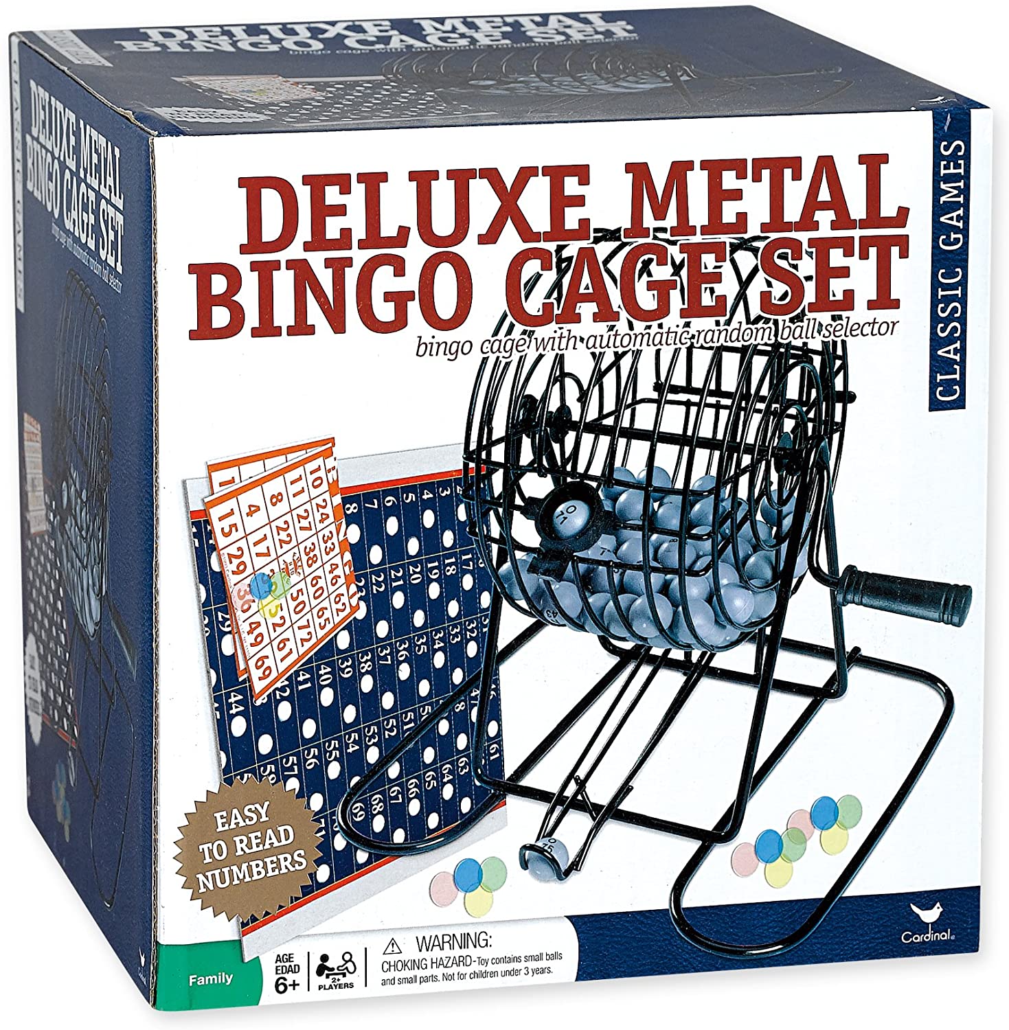 Bring the fun and excitement of Bingo home with the Deluxe Metal Bingo Cage with automatic random ball selector. With easy to read numbers, Bingo cards and markers included, you’re ready to play Bingo anywhere.