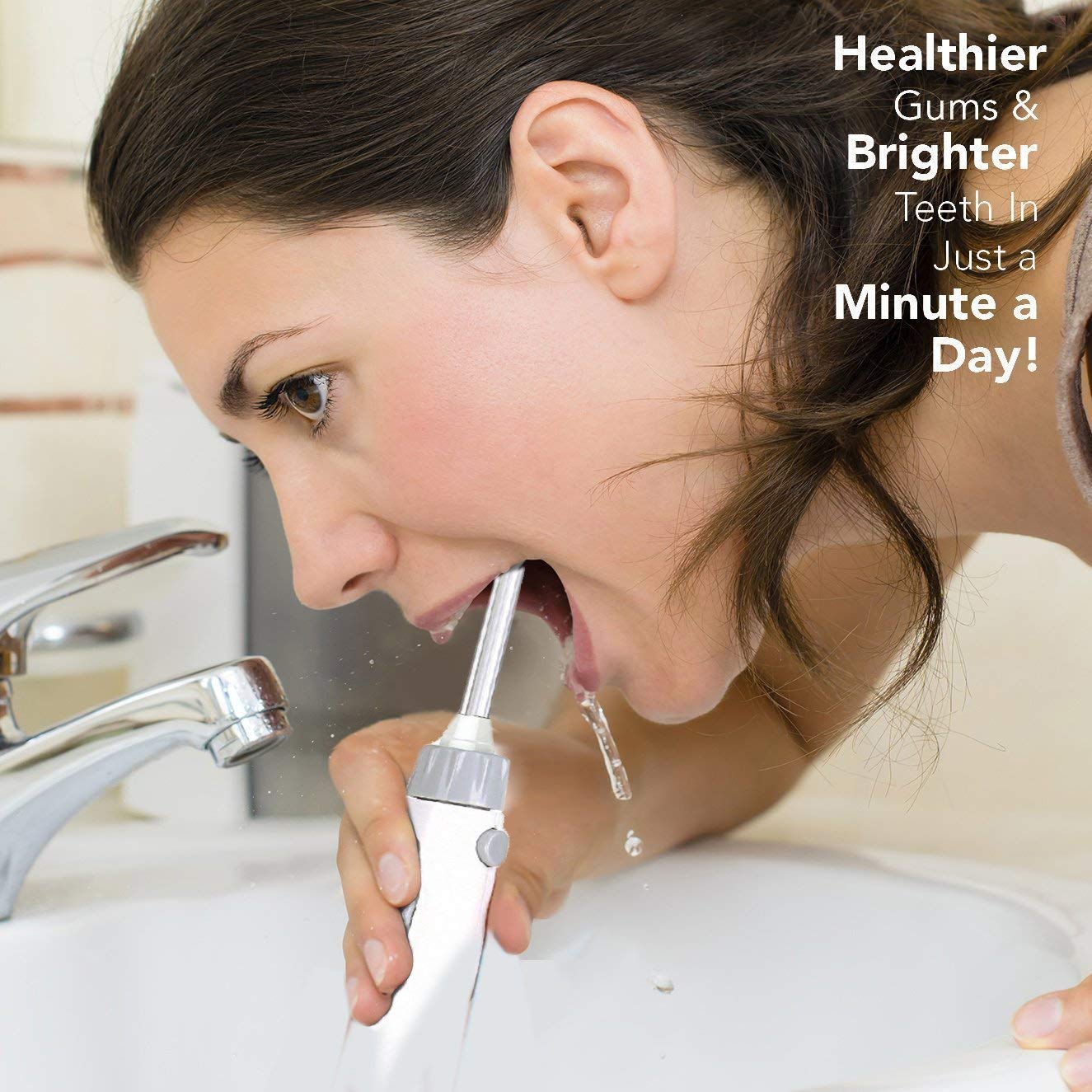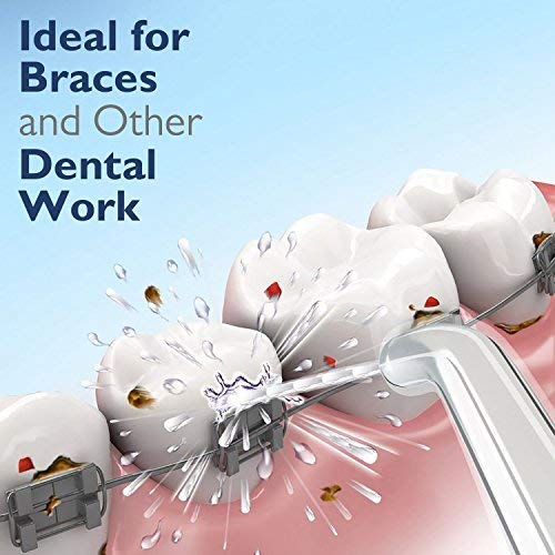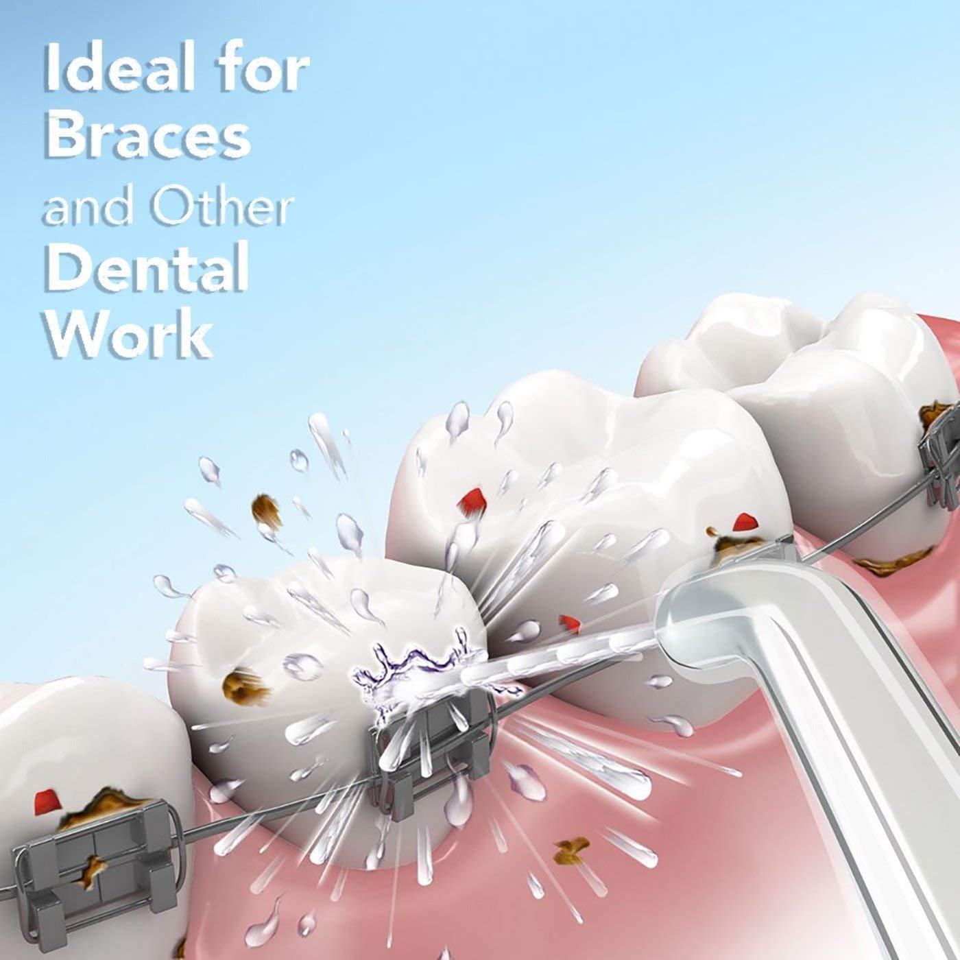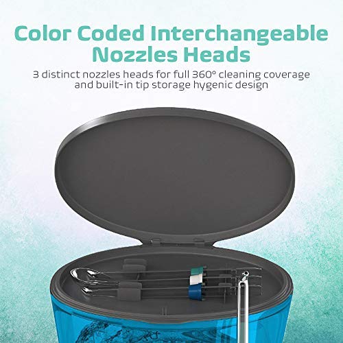 MULTIFUNCTIONAL TIPS: Water flossers for teeth come with 3 BPA free interchangeable nozzles that rotate 360 degrees to reach all sides of your mouth, removing plaque around braces, implants, bridges, and crown - It comes with a tongue scraper to prevent bad breath