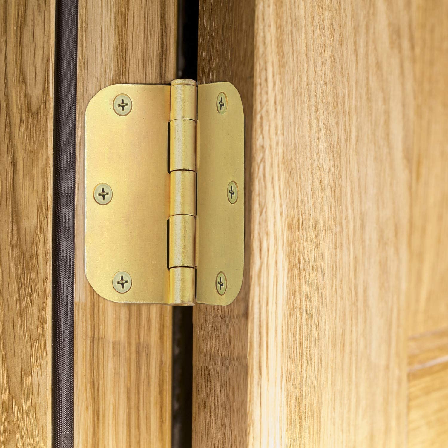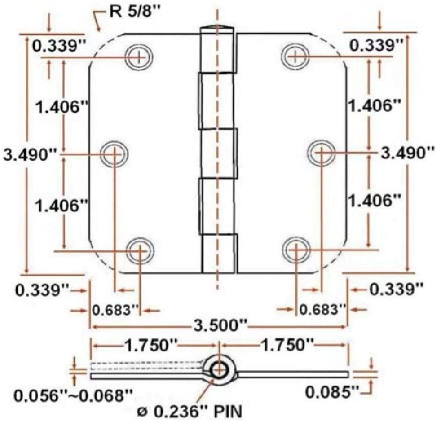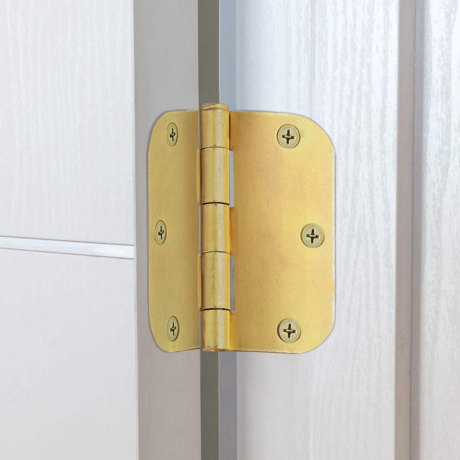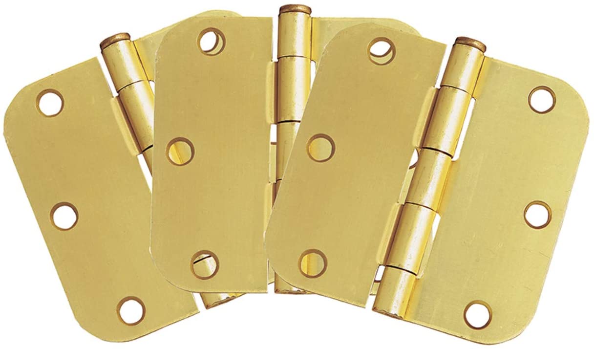 The Design House 181396 3-Pack Hinge 3 5" in Satin Brass has a 5/8" radius corner for use on residential duty wooden doors These door hinges are made of steel with a staggered hole pattern Each hinge has 6 holes and measures 3-1/2" x 3-1/2" x 7/16" These hinges do not have a removable pin and screws are included Comes with a 1-year limited that protects against defects in materials and workmanship