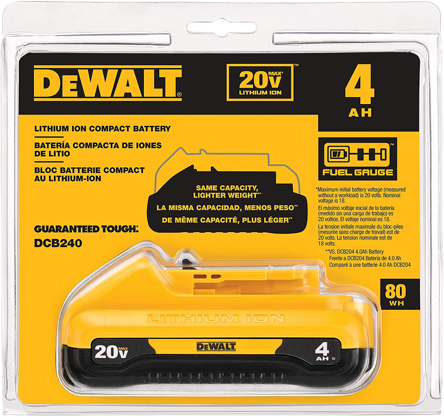 The DCB240 20V MAX* 4Ah compact lithium ion battery provides the highest capacity within the DEWALT 20V MAX* compact battery lineup. Using state-of-the-art lithium ion technology, the DCB240 delivers up to one-third more run time while maintaining the same size and weight as the DCB230 20V MAX* 3Ah compact battery. Its small size and light weight provide ergonomic benefits for increased tool maneuverability and control for overhead applications. The DCB240 includes a fuel gauge LED charge indicator and 3-year limited .