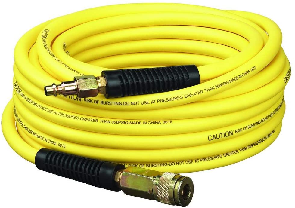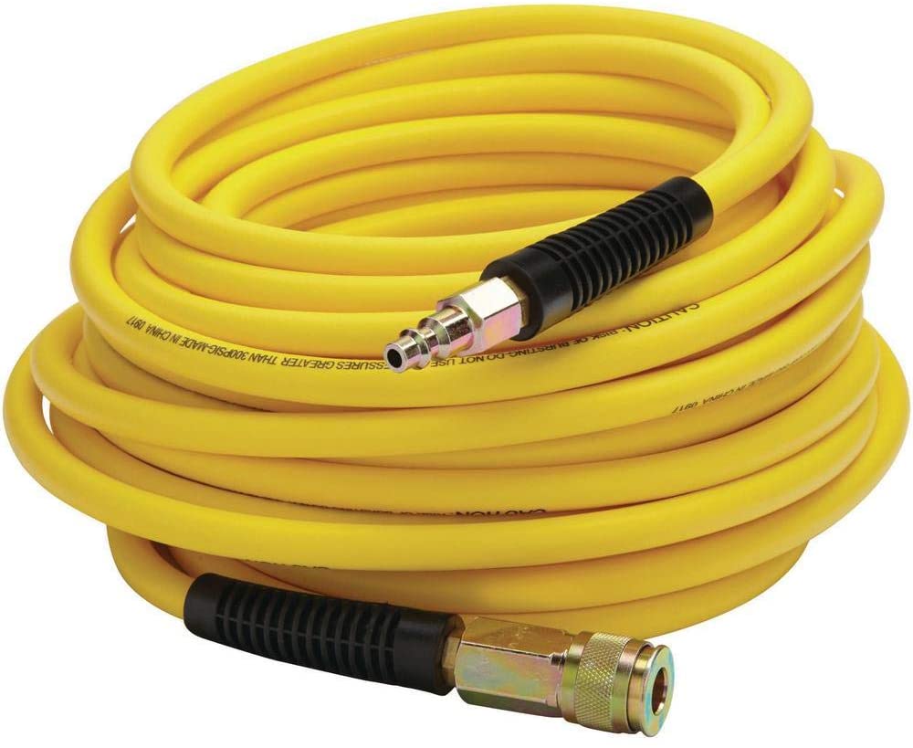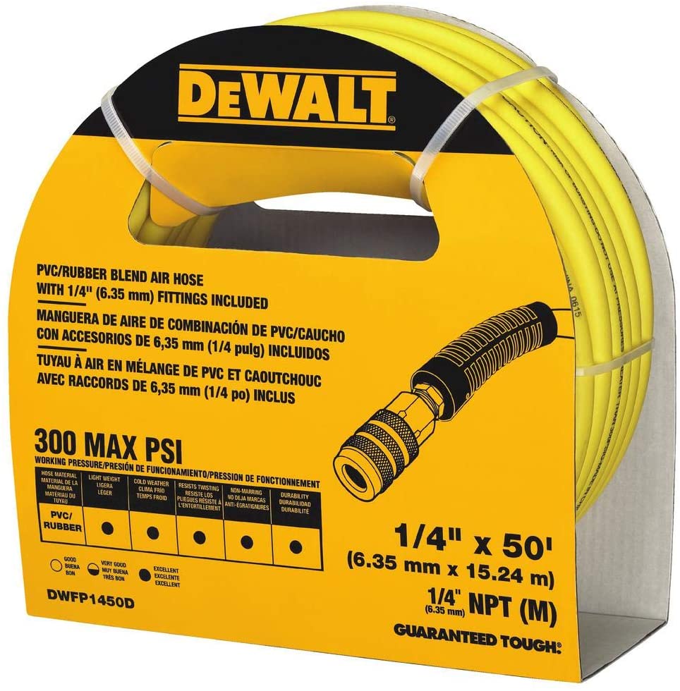 The DEWALT 50 ft. Air Hose is designed to withstand the rigors of your job site. This premium air hose is constructed from a hybrid polymer blend of PVC and rubber that is designed for maximum longevity. The non-marring design is abrasion resistant, lightweight and features a low memory to resist twisting and kinks during use.