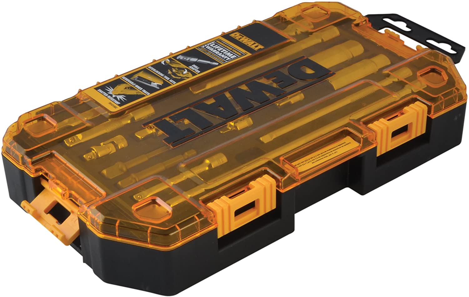 This 15-piece 1/4-inch and 3/8-inch Drive Tool Accessory Set is portable and can easily be transported between work areas. This set features a removable inner tray designed to fit in most tool chests with standard height drawers. This set is part of a full storage solution under the DEWALT brand that contains other interlocking stackable sets giving a user freedom to customize and carry their tools.