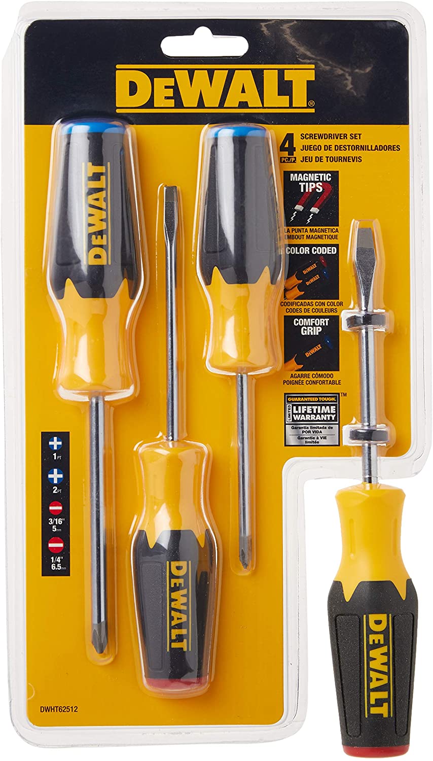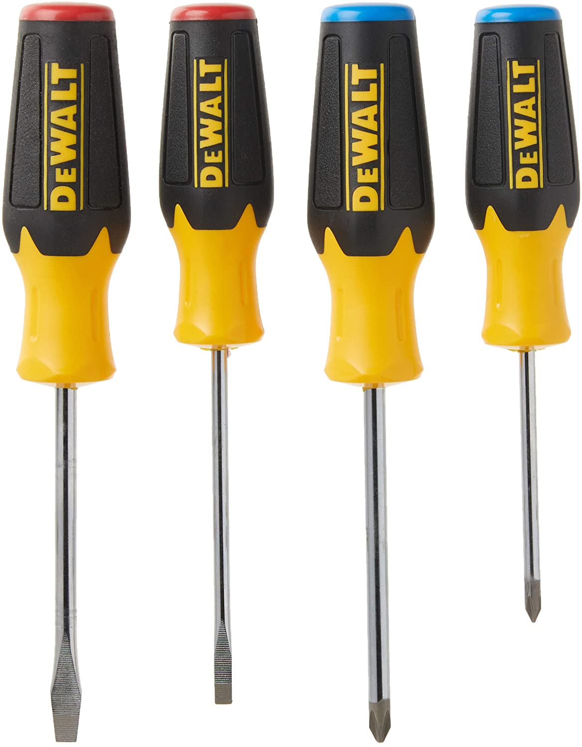 DEWALT Screwdrivers have ergonomically designed quad-lobular handle design that provides maximum tip torque. They have a slip-resistant rubber grip increases user comfort. Their precision machined and sand blasted tips grip faster securely and resists slip out. Lacquer coated bar resists rust. The magnetic tip holds screw securely while driving. They have color-coded handles for easy selection from the tool pouch or box.