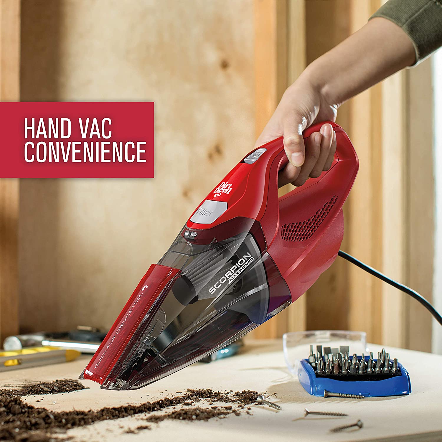 The Dirt Devil Scorpion Plus Hand Vac delivers Upright Power with Hand Vac convenience. It gives you long lasting performance so you can tackle the biggest messes. Clean tight spots with the QuickFlip Crevice Tool and take less trips to the trash can with the Easy-Empty Dirt Cup. A long 15 foot power cord gives you the freedom to clean complete car interiors and stairs. 7 Amp Motor