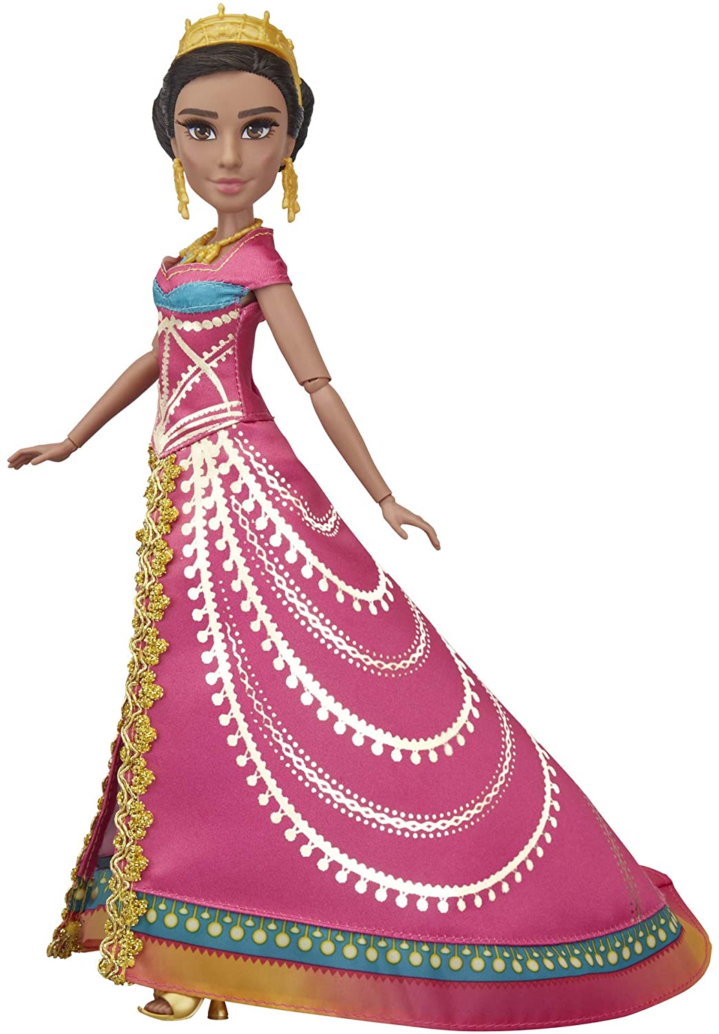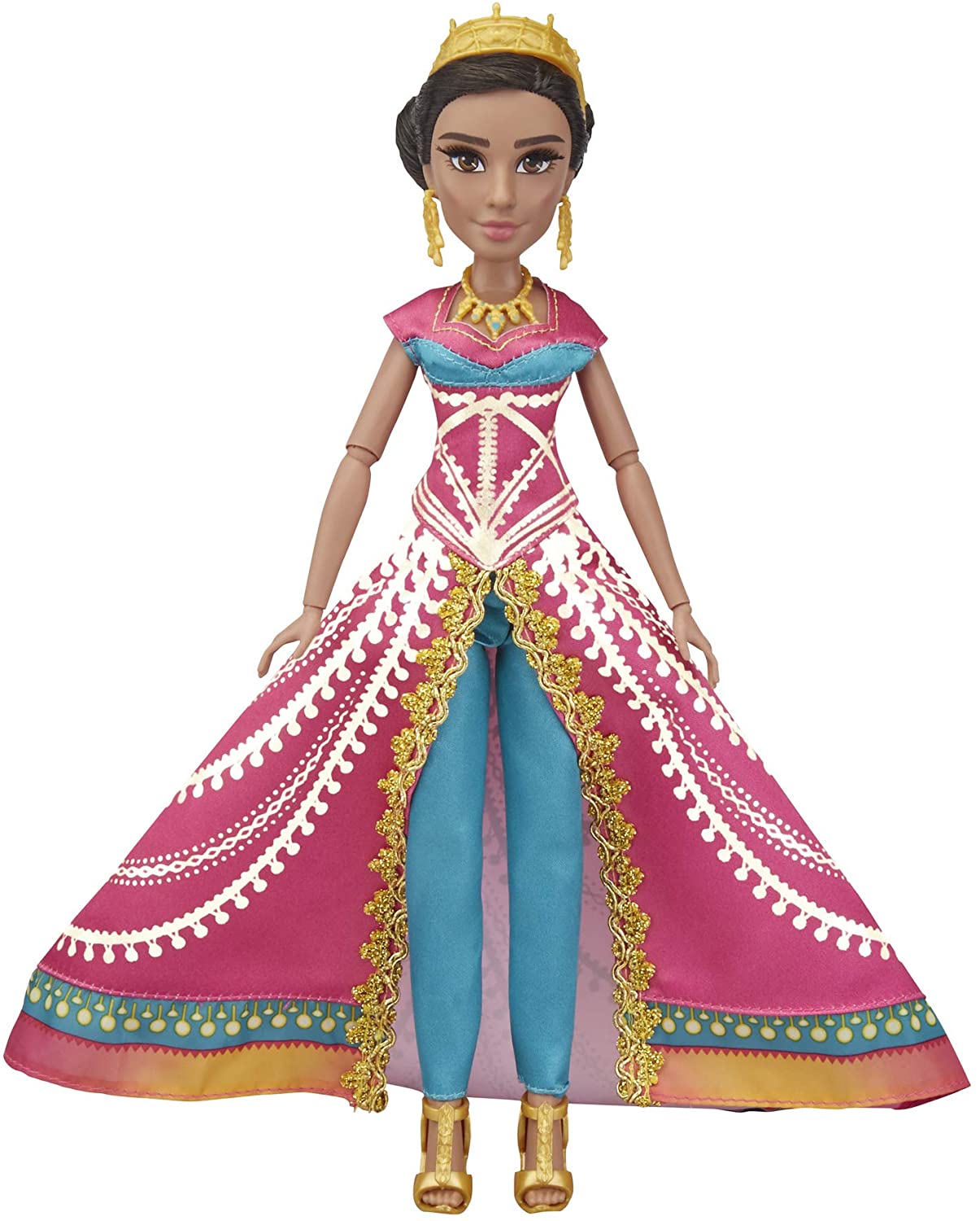 Disney's Jasmine is a beautiful, headstrong princess determined to have a say in Who she marries and how she lives her life. This fashion doll's striking style is an excellent complement to her spirited, courageous personality in Disney's Aladdin live-action movie. This deluxe Jasmine doll features a stunning ball gown fit for evening adventures with matching Accessories -- crown, earrings, necklace, and shoes. She also has long hair and luxurious eyelashes.