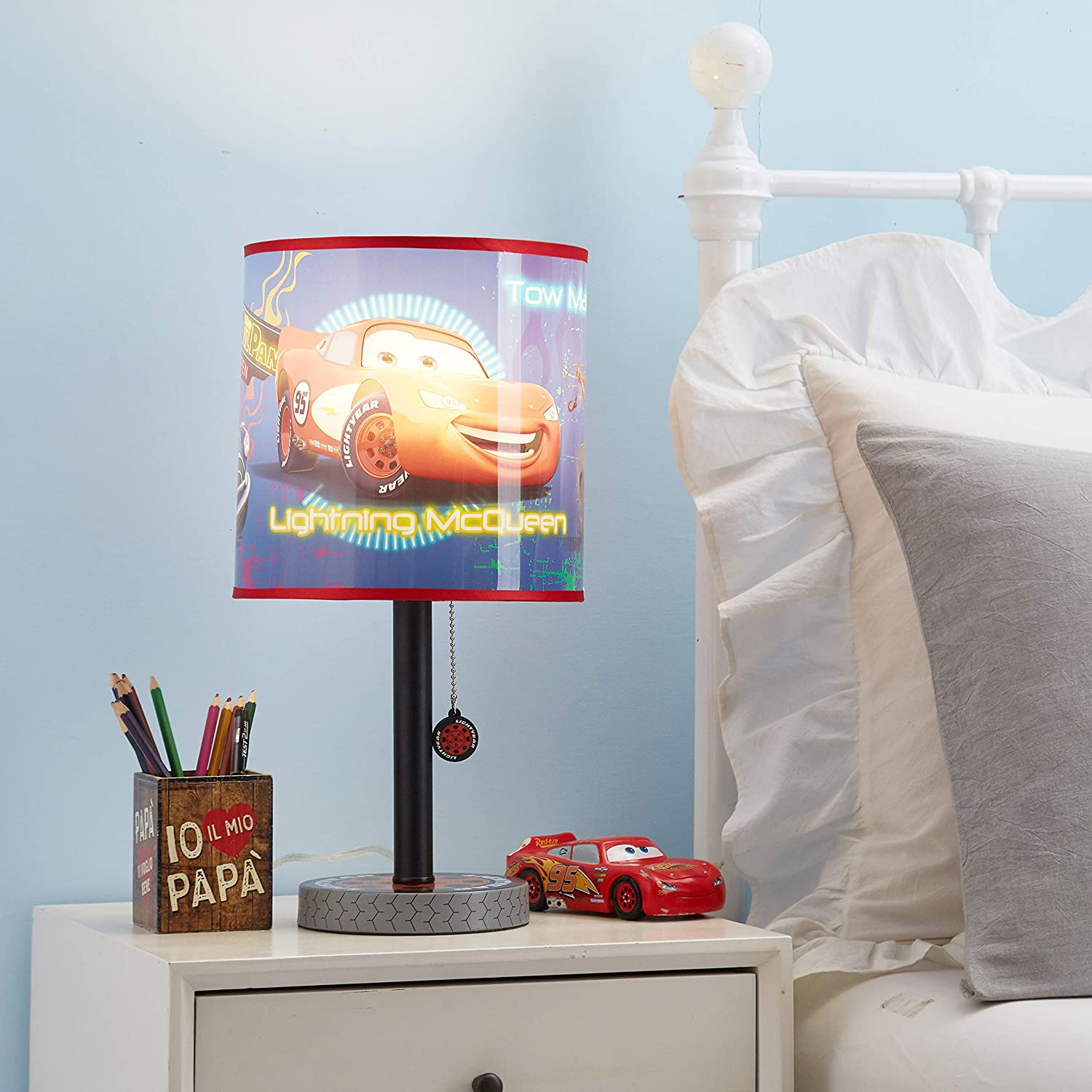 Brighten up your child's room with this adorable Disney Cars Table Lamp. This Disney Cars Lamp imitates a tire, while the shade sports vivid Disney artwork. Unlike conventional lamps, this kids' Disney table lamp includes a handy, decorative pull chain. Your kids will love to turn it on and off over and over again. Also, the chain on the Disney Cars Table Lamp has a playfully designed toy-tire disc at the bottom to enhance its appearance. Apart From being a night lamp, the Disney Cars Table Lamp coordinates with other Disney Cars accessories or a Disney-themed room. Designed with the safety of children in mind, this lamp is safe and easy for children to operate. If your kids love the Disney movie Cars, McQueen, or having a car-themed room, the Disney Cars Lamp is a must-have functional room decoration. This Disney Cars Table Lamp measures 5" long x 5" wide x 13.2" high.