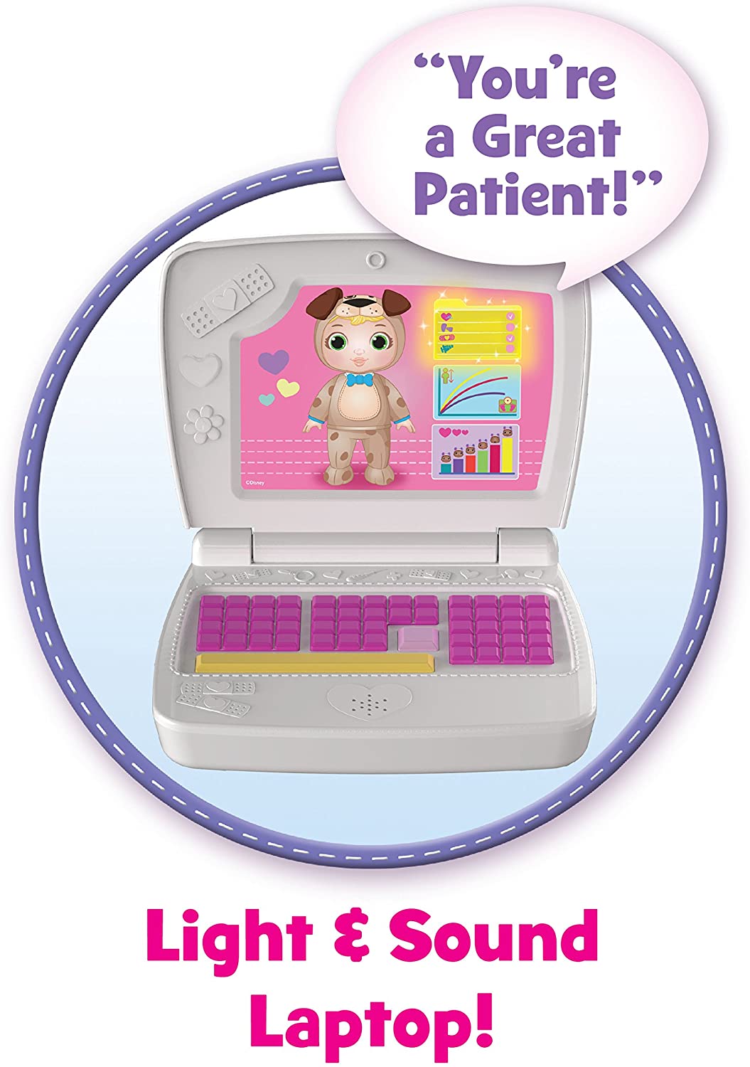Disney Junior's Doc McStuffins is learning all about baby care thanks to her role as a Chief Resident. Preschoolers can nurture and care for their baby dolls right alongside Doc with the All-in-One Nursery – an adorable role-play center full of exciting doctor features and accessories to explore! Use Doc's portable electronic patient laptop to diagnose, featuring a light-up screen, sounds and lullaby music. The light & sound stethoscope is perfect for checking baby's heartbeat. When it's time for a checkup, measure baby's height and weight on the scale and use the special nursery tools. After the checkup is complete, give the baby patient a bandage from the sticker dispenser. When it's time for a nap, spin the baby mobile and rock the cradle – the best prescription for sweet dreams! Ages 3+ Doc McStuffins Baby Check Up All-in-One Nursery offers top-notch care for your little one's baby dolls. Includes: one light and sound stethoscope, one light and sound play laptop, one play baby scale, one play otoscope, one play thermometer, one play bandage, one play aspirator, a baby mobile, a sticker dispenser with fun sticker sheets and a manual rocking cradle. Set is compatiable with the Doc McStuffins My Nursery Palls dolls (sold separately). Requires three AG-13 or three AAA batteries (not included) Ages 3+.