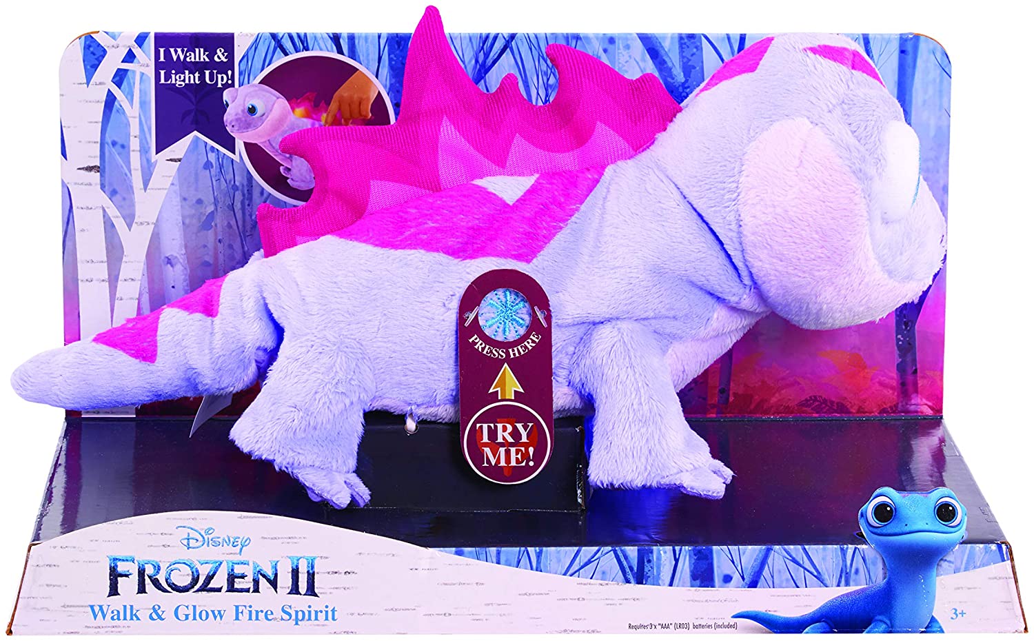 - Bring home the magic and excitement of Disney’s Frozen 2 with the Disney’s Frozen 2 Walk & Glow Fire Spirit. Press the button on his back and Bruni the Fire Spirit’s flames glow, just like in the movie. This sizzling salamander even walks and features sound effects from the film. Made of soft fabrics, and lit with LED lighting, Bruni is approximately 12” long. Requires 3 x AAA batteries (included). Ages 3+.