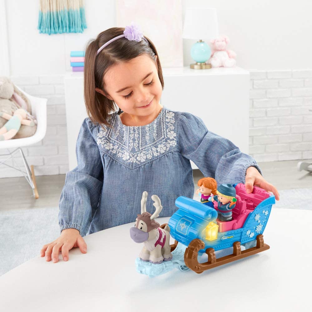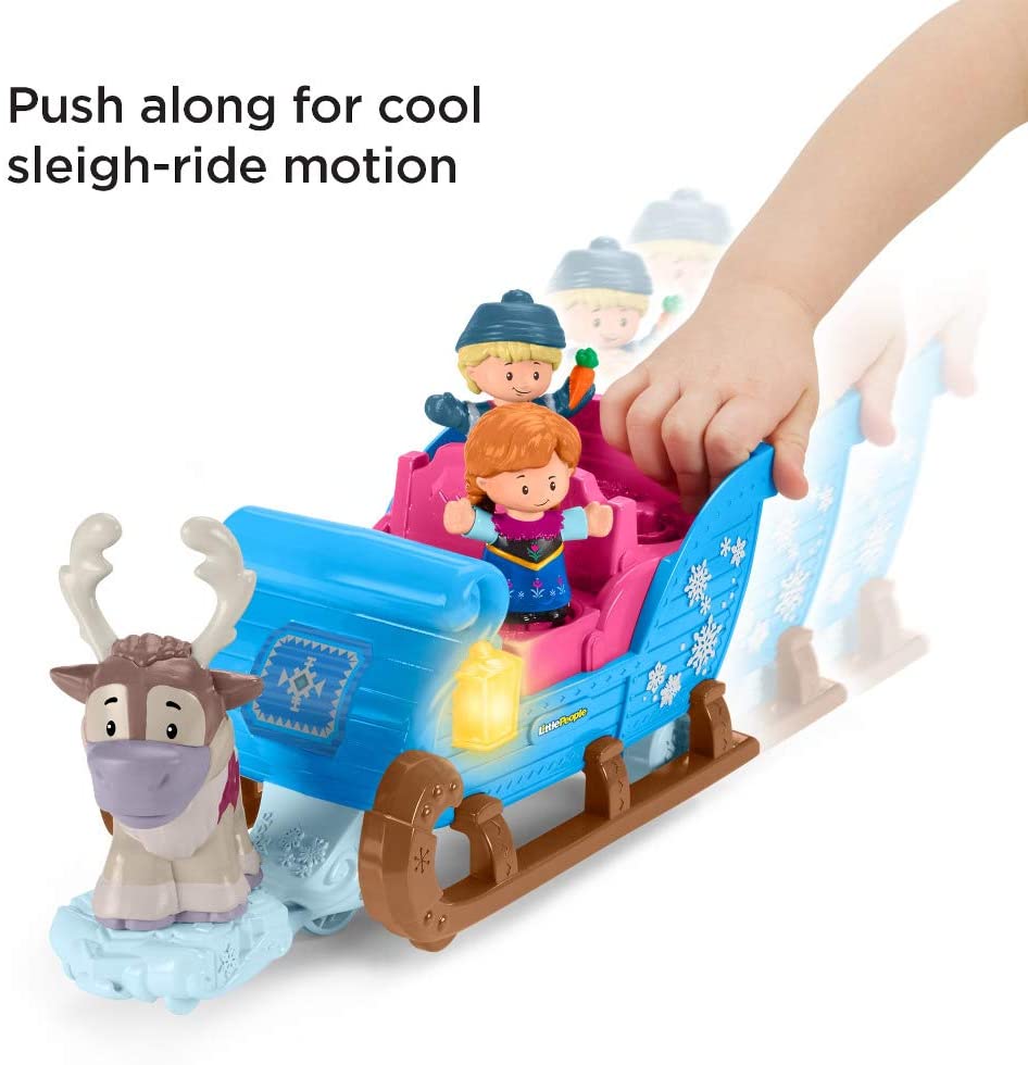 Your young Disney fan will love recreating their favorite moments from the hit film, Frozen, with this adorable Little People vehicle set. Kids can send Anna, Kristoff, and Sven the reindeer on a magical journey through the snow in Kristoff's Sleigh, which makes fun sleigh-ride motions as it moves along! All three figures fit on the sled, with room for Elsa and Olaf! (Additional figures sold separately.)