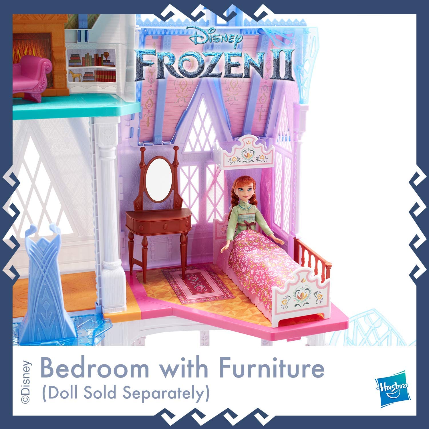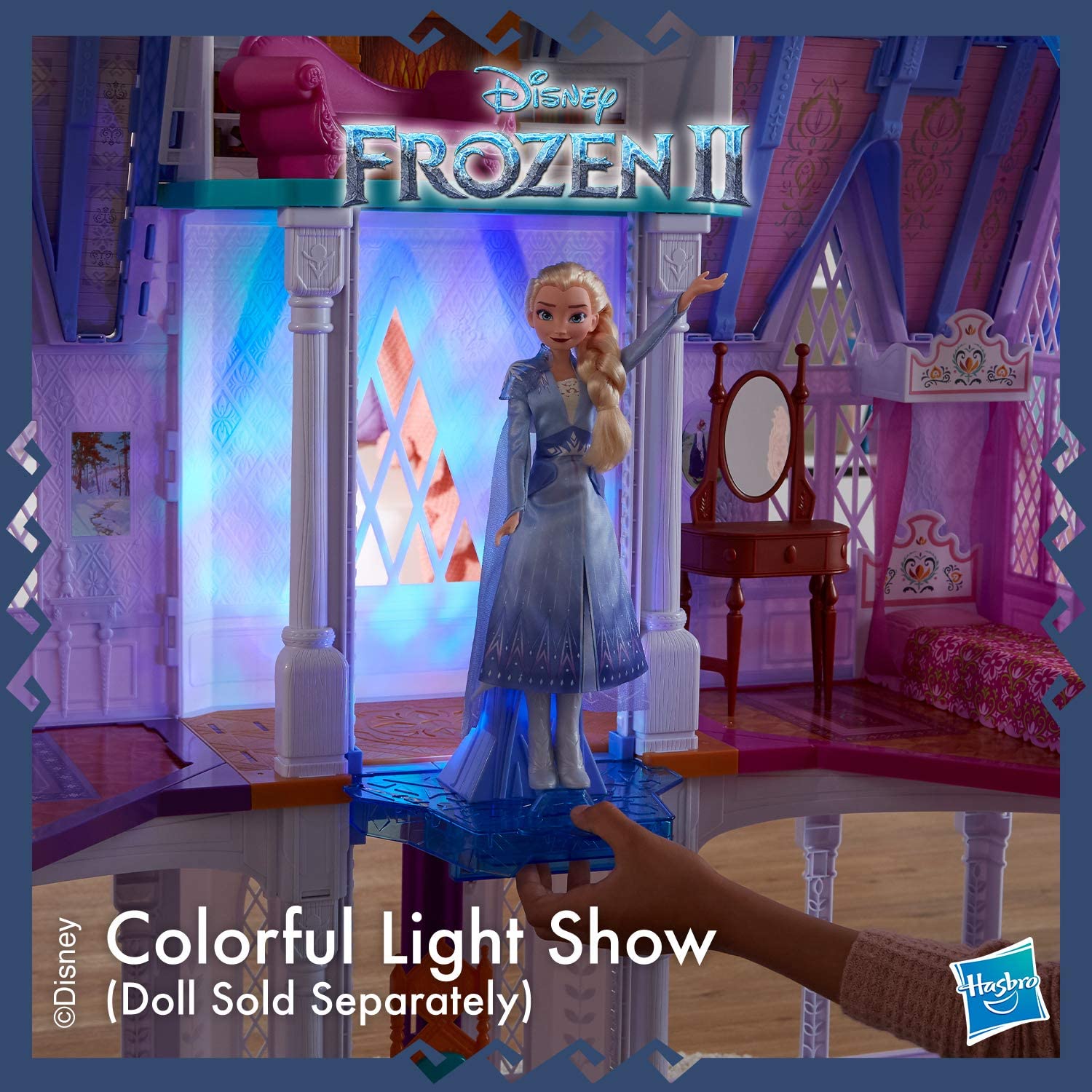 Inspired by Disney Frozen 2, the ultimate Arendelle castle is a feature-filled fashion doll playset for young fans of the Movies! Open the gorgeous gates and explore the castle's 4 floors consisting of 7 rooms: kitchen, music room, and throne room on the first floor, a vanity room and bedrooms for Anna and Elsa dolls (not included), A library on the third Floor, and a lookout tower on top. The Frozen castle is 5 feet tall and 4 feet Wide and includes 14 accessories to fill it up, like a piano, throne, banquet table, vanity, sofa, and more to play out fun scenes in each room. When kids push the button on the moving balcony, they can see a colorful light show inspired by the Northern lights! Pull out the extending carpet in front of the throne to complete the royal décor. This majestic castle makes a great a holiday gift or birthday present for kids ages 3 and up who love the magical world of frozen! Copyright Disney. Hasbro and all related terms are trademarks of Hasbro.