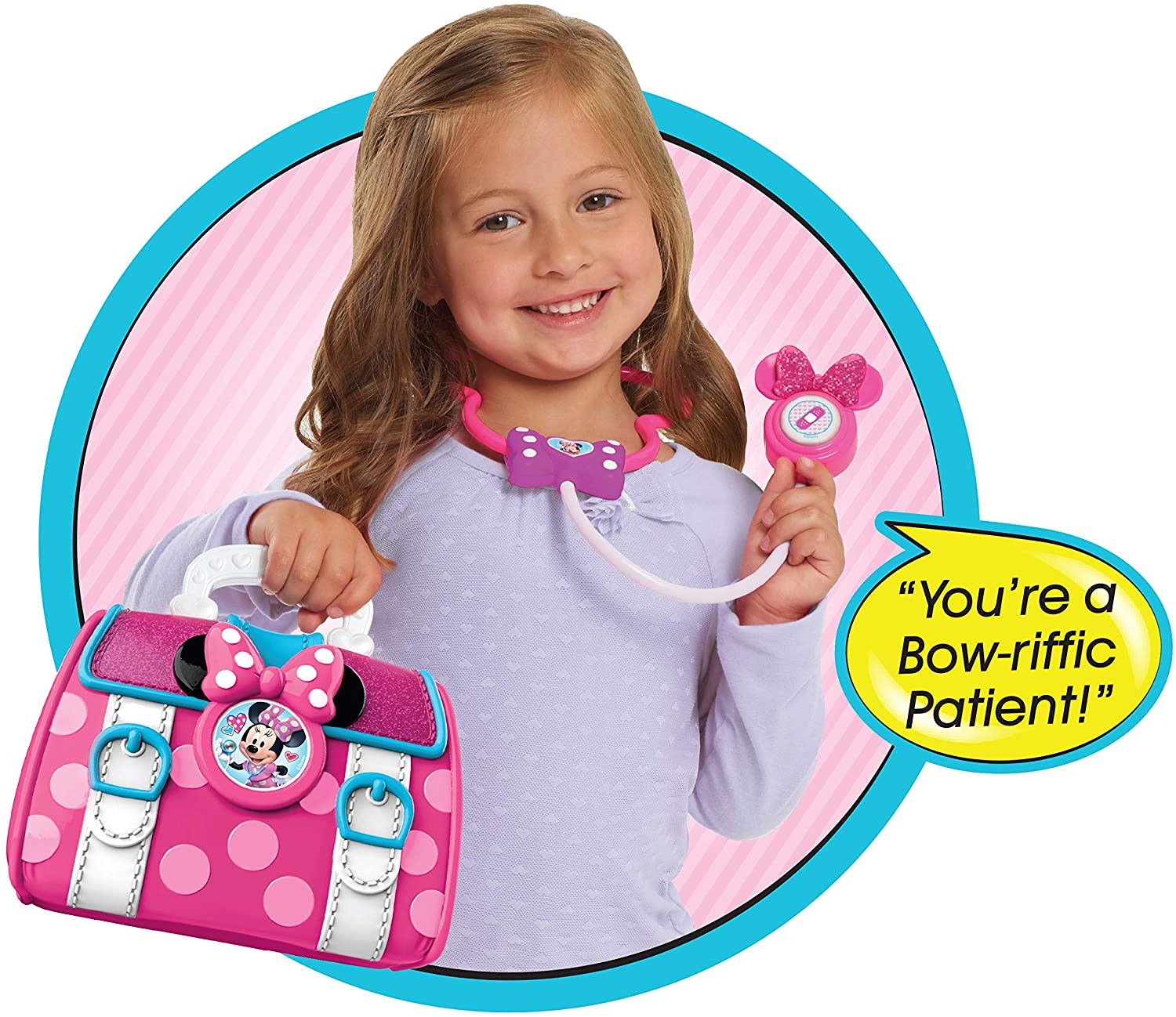 - Fans of Minnie Mouse will love taking care of their friends with the Minnie Bow-Care Doctor Bag Set. This set includes everything your little one needs to complete a check-up, including a pretend thermometer, syringe, otoscope, bandage cuff, and 2 pages of color bandage stickers.