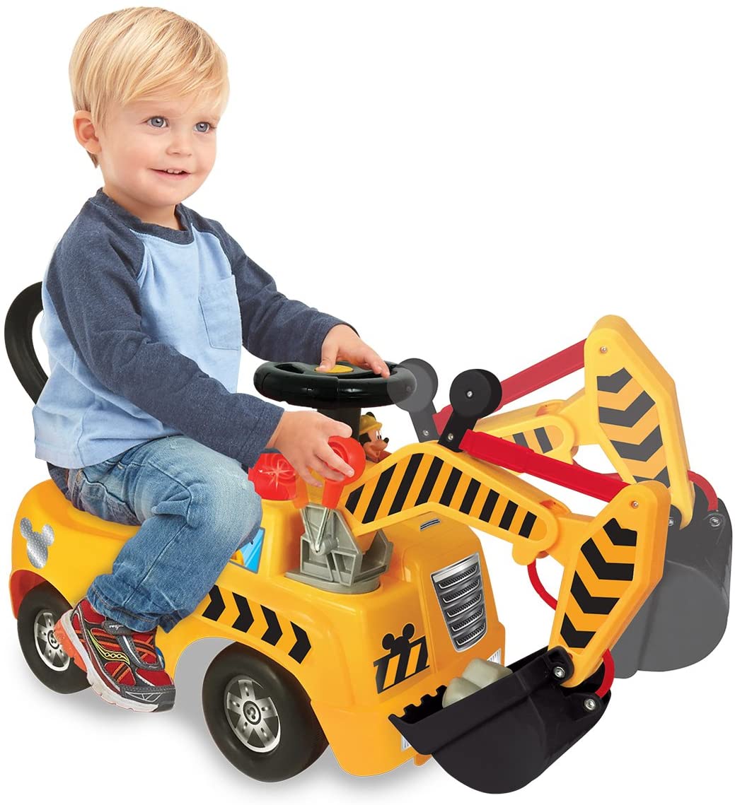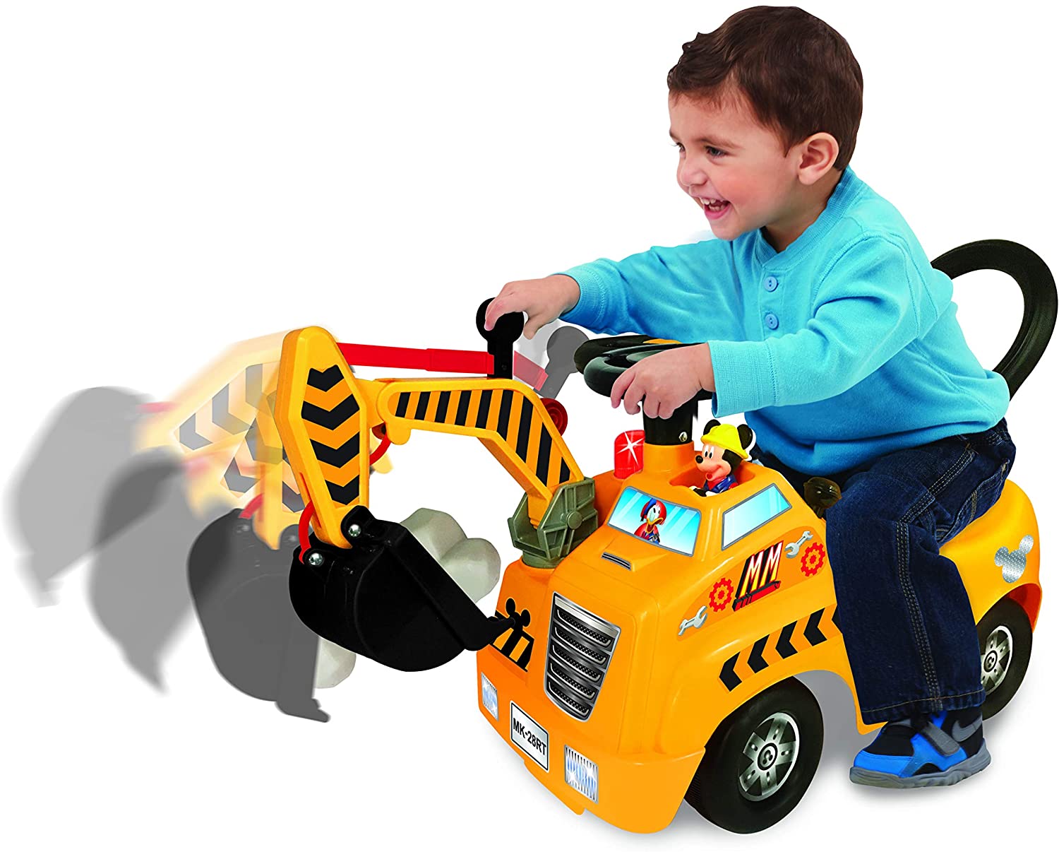 Mickey plays his favorite songs! with interactive activities to play rewarding lights and fun sounds. Press key for revving engine, or steer wheel and honk horn for a real driving experience. Slide lever on the side of the ride on to move the crane arm up or down for role-play fun.