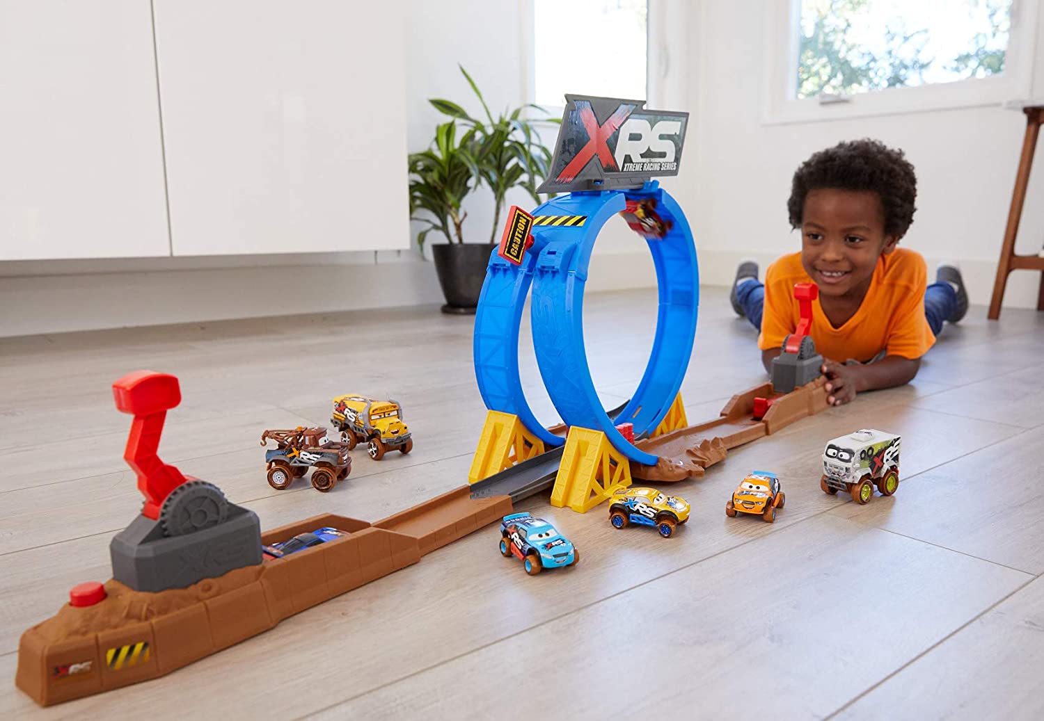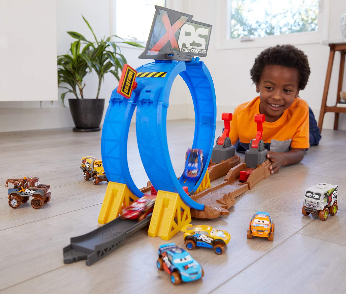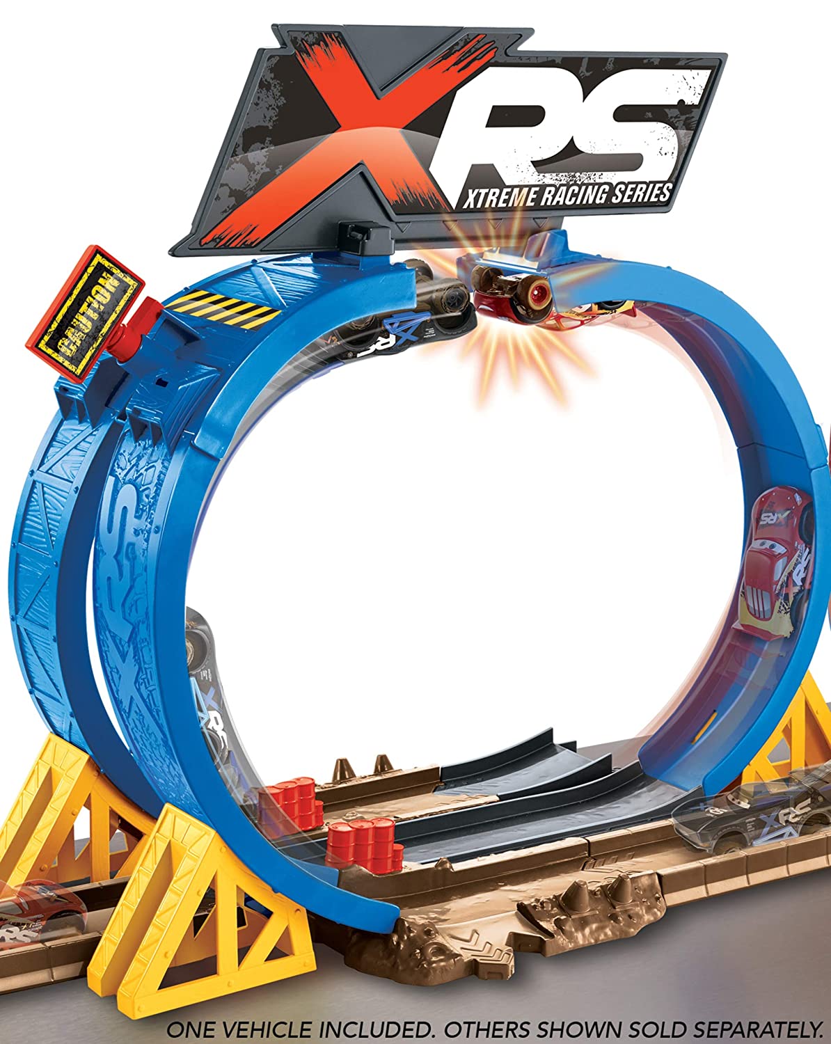 Disney/Pixar's cars fans get looping, launching and crashing fun with this extreme racing playset! Themed after the XRS mud racing series, the crash challenge set lets you launch your favorite XRS mud racing Vehicles into action. Enjoy storytelling action with multiple ways to play like side-by-side competition, head-to-head racing with a big crash payoff, or solo training! Launch one car at a time or face off with two cars and race to the finish. The first car to hit the diverter will cause the competitor to crash off the track. If you're victorious, you get the thrill of crashing through barrels as you Burst out of the race. Increase the challenge and the danger with the adjustable loop and go for the stunt again! Flaunt your champion status with your working suspension and bounce off to your next competition! Includes 1 XRS mud racing vehicle to start the play right away. Other XRS racers sold separately, subject to availability.