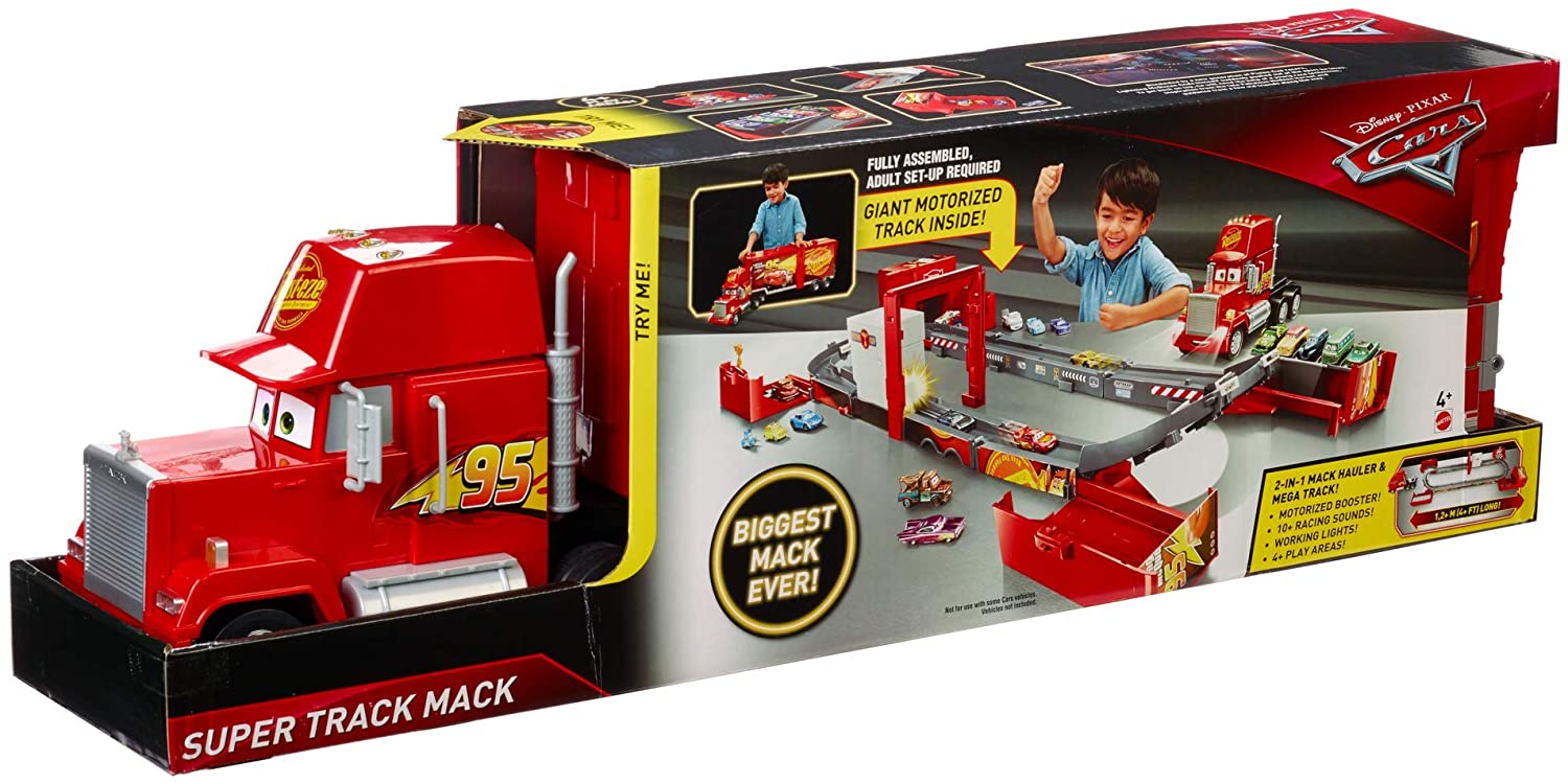 This huge Disney/Pixar's Cars Mack hauler packs two ways to play in one cool toy. Lightning McQueen's favorite transporter features iconic Rust-Eze #95 sponsor panels plus working head and cab lights and realistic sounds. Drive him to your next competition, park and separate the cab from the trailer to open and transform Mack into racetrack mode! Place your favorite 1:55 scale character cars at the starting line and then use the booster to send them speeding around the Piston Cup track. Mack's cab makes iconic racing sounds to enhance the excitement. Brave the banked turns as you hear engines roar, horns honk, the crowd cheer and cars speed by. The Super Track Mack Playset works with most 1:55 scale vehicles, sold separately, subject to availability. Colors and decorations may vary.