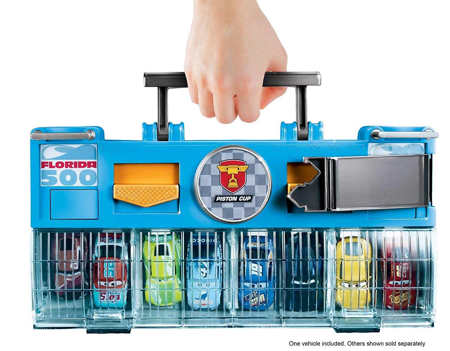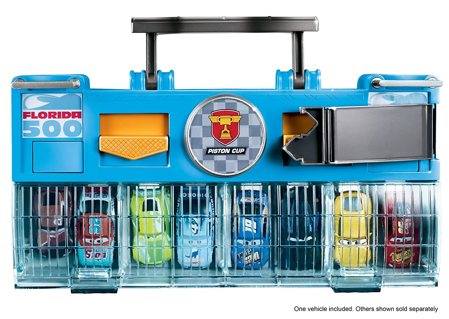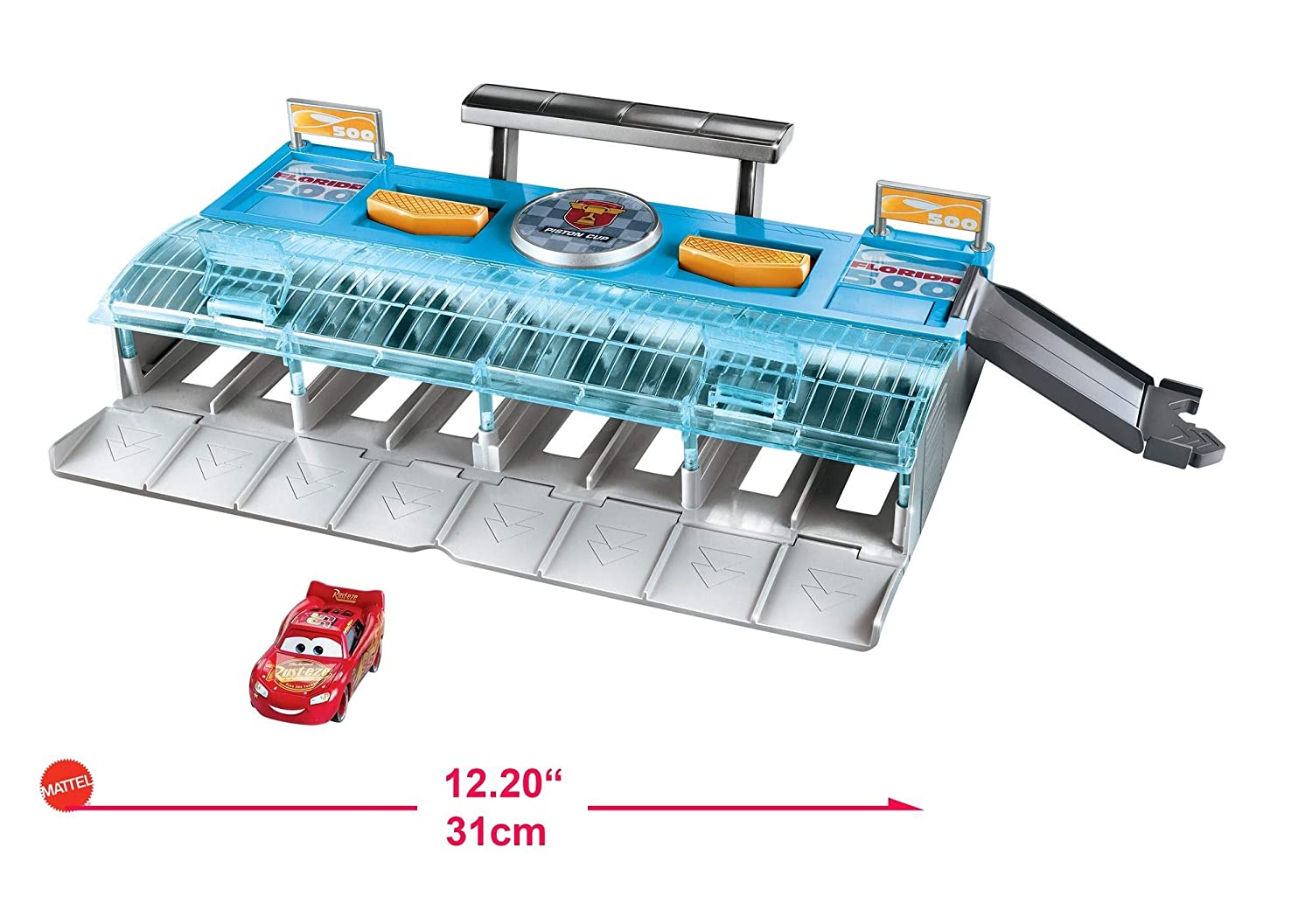 Enjoy big Disney/Pixar Cars competition thrills on this whopping 8-lane race set! Place your favorite racers in the starting position, then launch them into action. This colorful competition set includes a ramp to the top viewing deck, true-to-movie racing decos, a winner's platform and a Lightning McQueen vehicle. Race against multiple cars at once, just like the pros! At the end of the racing day, pack everything inside and take your champion wheels on the road to fun! Other vehicles sold separately, subject to availability.