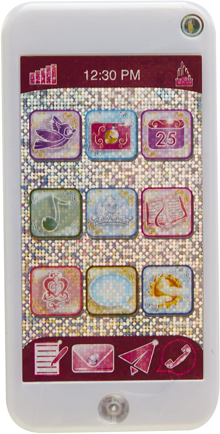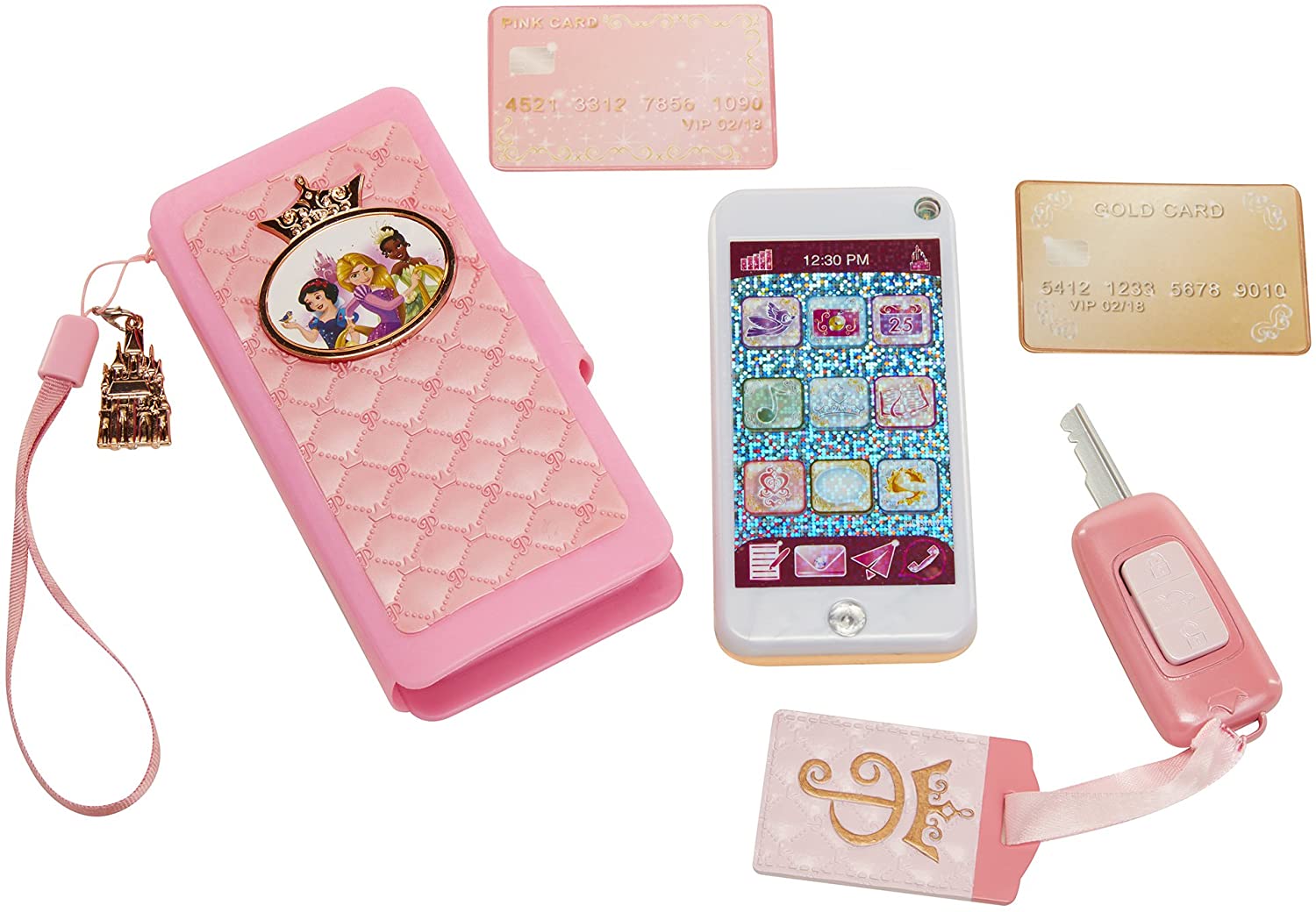 - Includes: play smartphone w/led lights and sounds, wallet case, key fob, 2 plastic play credit cards, and ribbon with castle charm