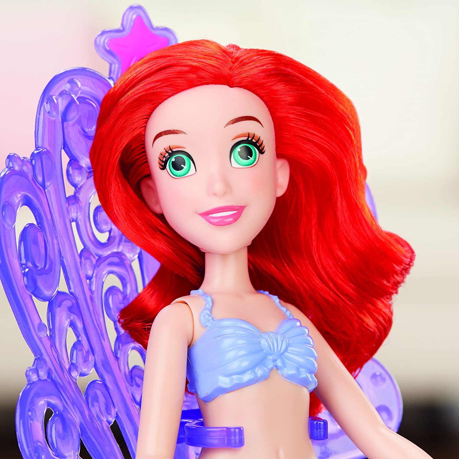 Imagine Disney's Ariel exploring her kingdom in a seahorse drawn carriage! Ariel can sit in the seat of the ornate, colorful sea carriage inspired by Disney's The Little Mermaid. Push her in the carriage and the seahorse will bounce up and down, mimicking a swimming motion. Kids can imagine riding in royal style with Ariel in her kingdom! Ariel comes with a removable pink tulle skirt. Hasbro and all related terms are trademarks of Hasbro. Copyright Disney