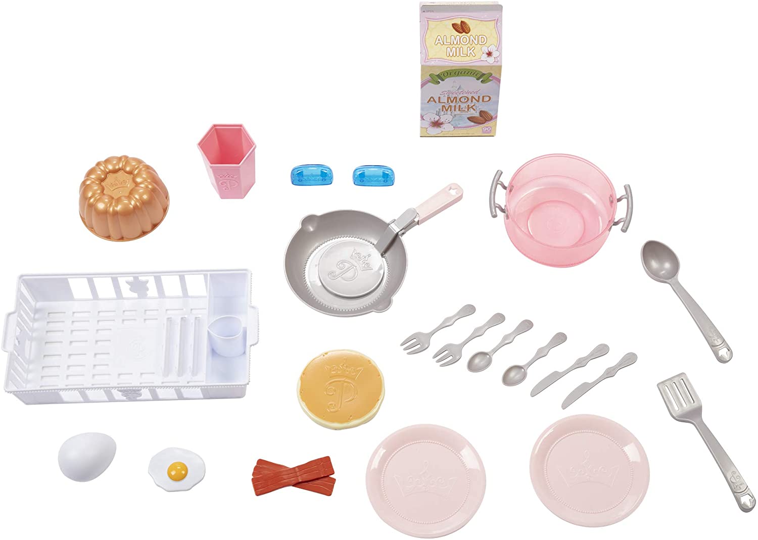 - Includes: 1 Kitchen, 1 Pot, 1 Flipping Fry Pan, 2 Spoons, 2 Forks, 2 Knives, 2 Plates, 1 Cup, 2 Ice Cubes, 1 Fried Egg, 1 Bacon Strip, 1 Pancake, 1 Hard Boiled Egg, 1 Spatula, 1 Serving Spoon, 1 Cake Pan, 1 Dish Rack and 1 Carton of Almond Milk