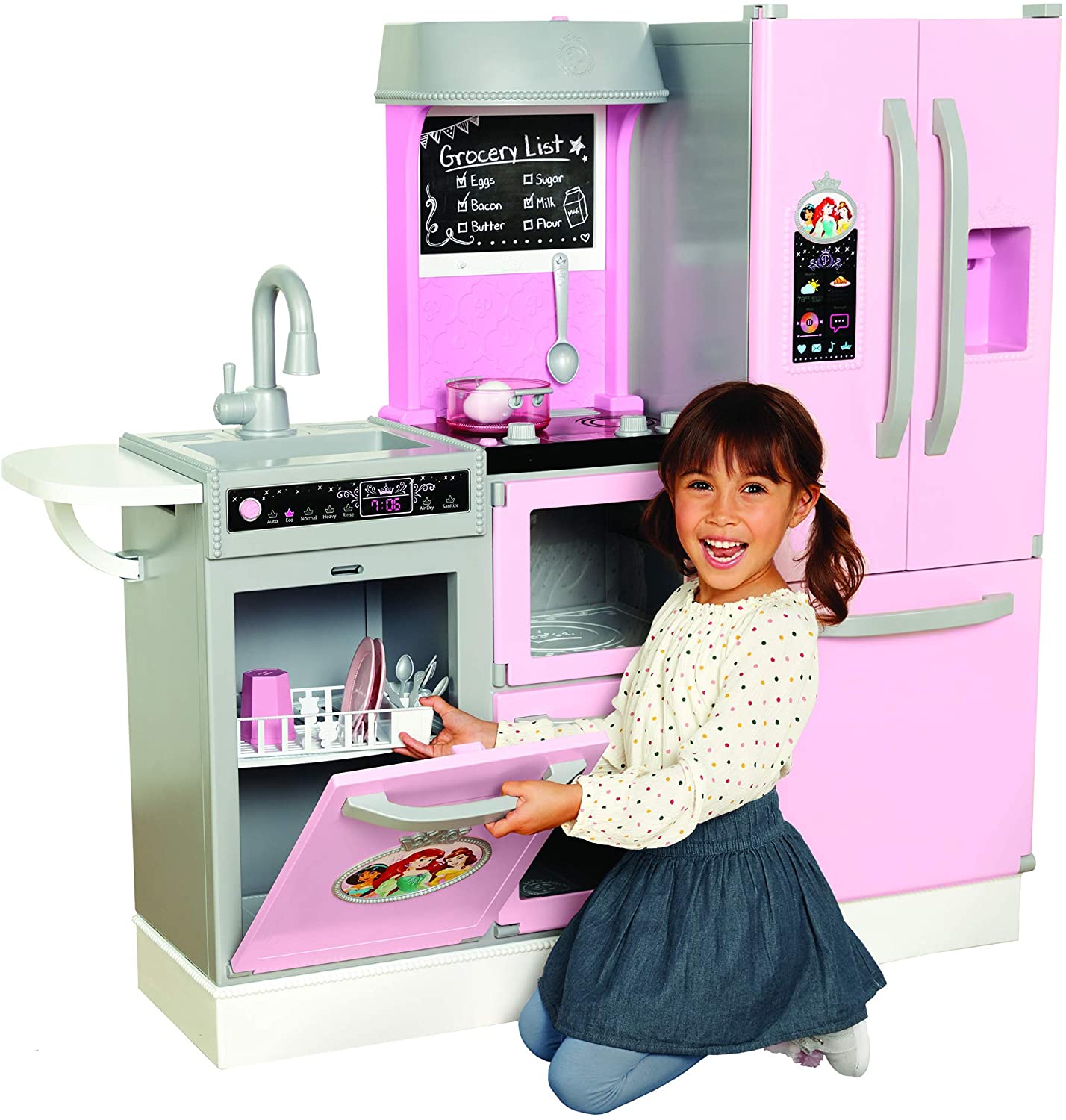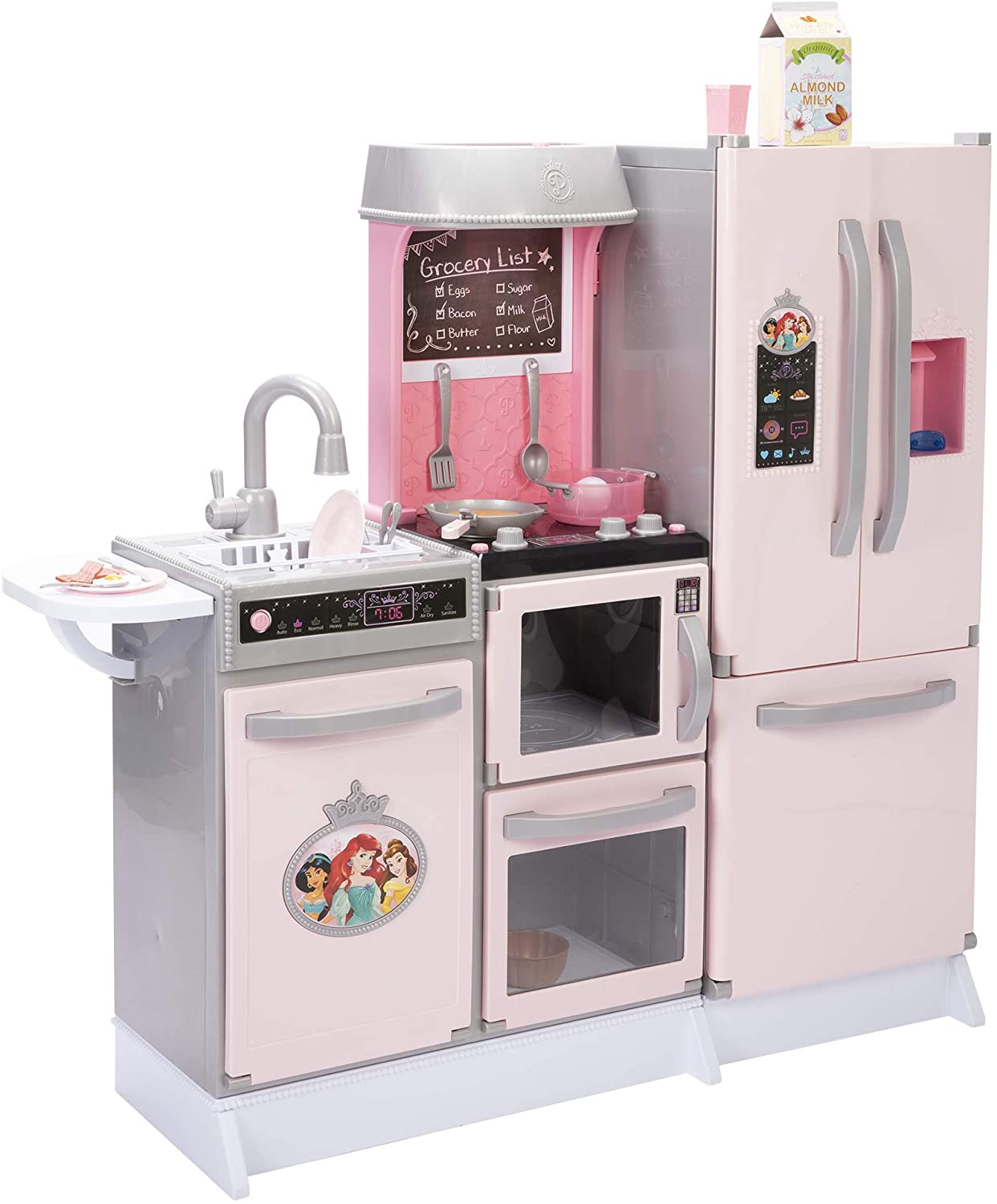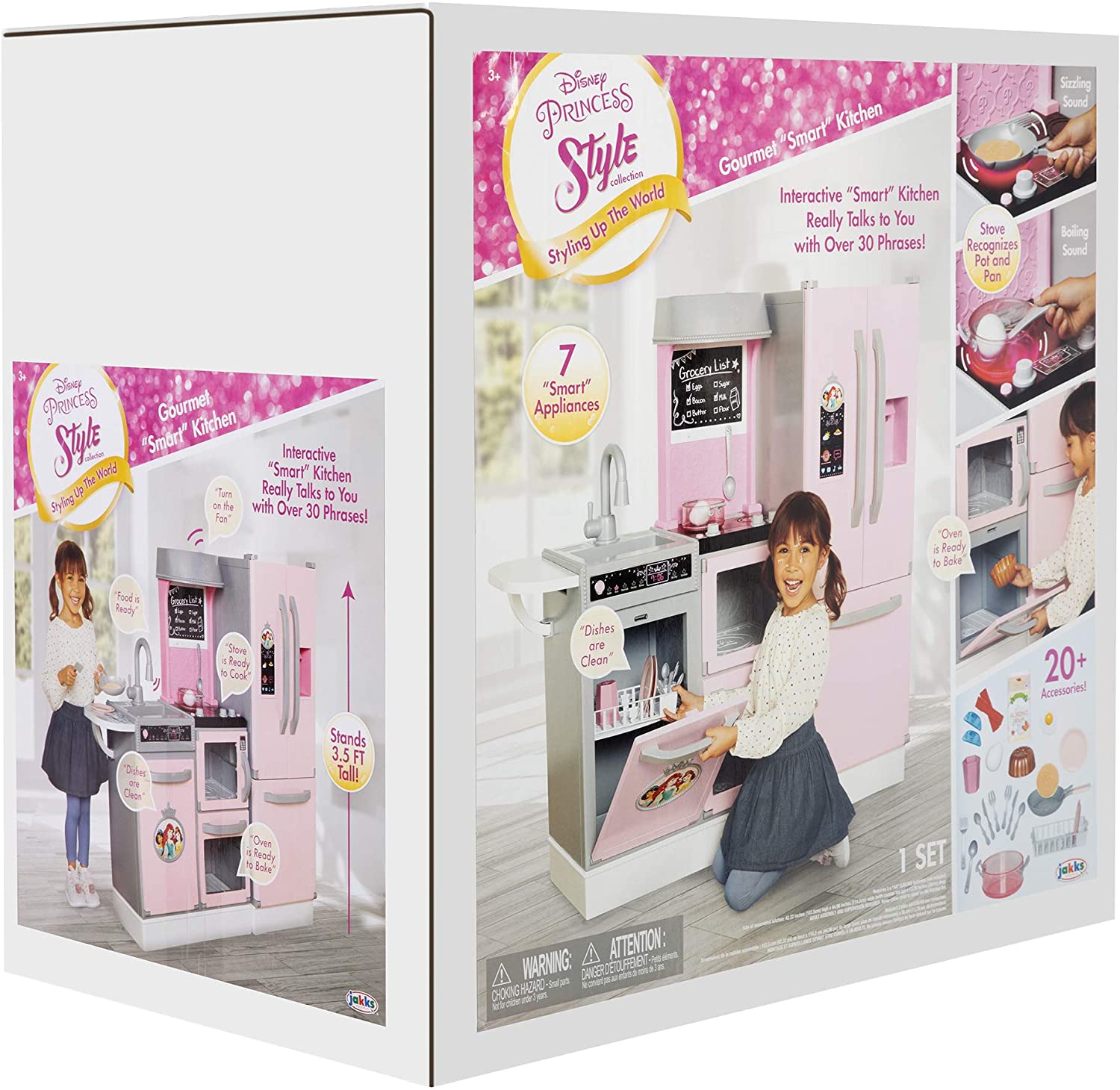 Sleek unique and oh so fun, the Disney Princess Style Collection combines everyday play with a contemporary Disney Princess flair. This collection of real-life inspired toys is meant for the modern girl with big goals and great style. She's a go-getter, a globe-trotter, a fashionista, and most of all, a girl who sets her own trends! Get ready to take on the world with the Disney Princess Style Collection! Sleek, unique, and oh so fun, the Disney Princess Style Collection is meant for every modern girl with big goals and great style. With its stunning design and high-tech features, this Gourmet Smart Kitchen takes your play cooking to the next level! This interactive kitchen includes seven feature appliances and over 30 sounds and phrases as prompts while you play. Turn handle on the faucet to hear water sounds and dishwater features washing sounds and indicates when cleaning cycle is complete. The overhead hood includes a fan sound. Microwave and Oven include lights and sounds. Refrigerator indicates when the door is left open and includes a play ice dispenser. The Stovetop includes light up burner and will even let you know when to flip your pancake or fried egg while using the fun flipping fry pan! The Gourmet Smart Kitchen comes complete with 20+ pieces, including cooking utensils, service for two, and foods items. Bon Apatite!