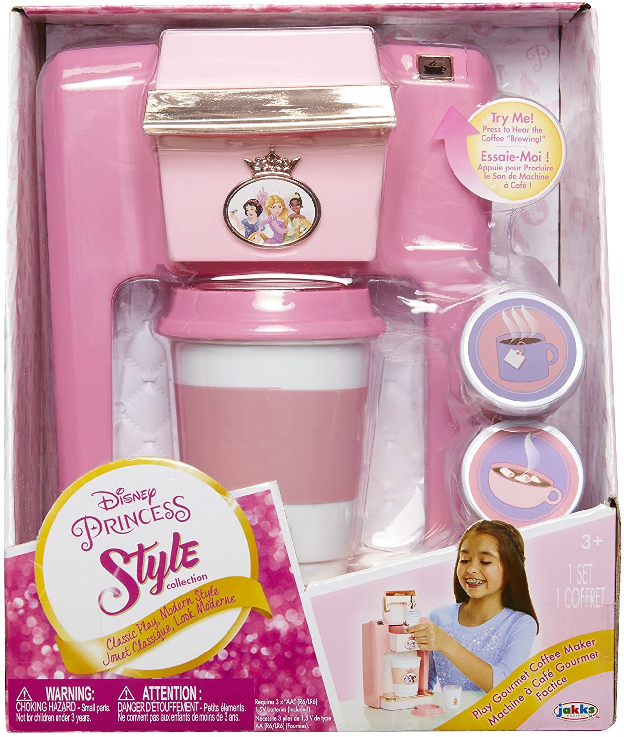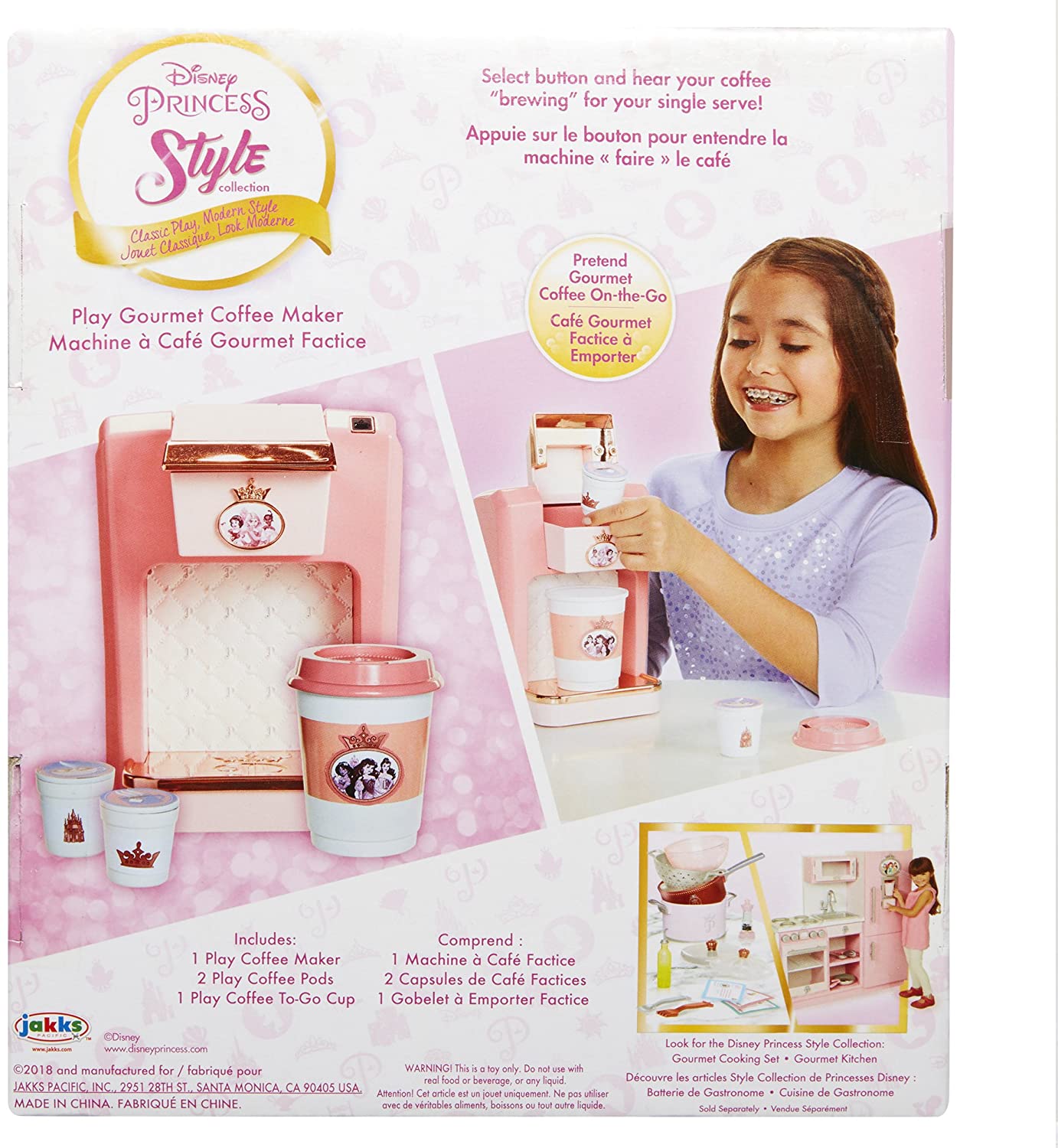 Rise and shine and make every day fantastic with the Disney Princess Style Collection Play Gourmet Coffee Maker. Grab your play to-go cup, insert your play beverage pods and press the button. Play Gourmet Coffee Maker even makes realistic brewing sounds. Perfect complement to the Disney Princess Style Collection Gourmet Kitchen and Cooking Set (Each Sold Separately). Hand wash with warm water, wash cloth and soap. Do not machine wash. WARNING! This is a toy only. Do not use with real food or beverage, or any liquid. Recommended for Ages 3+
