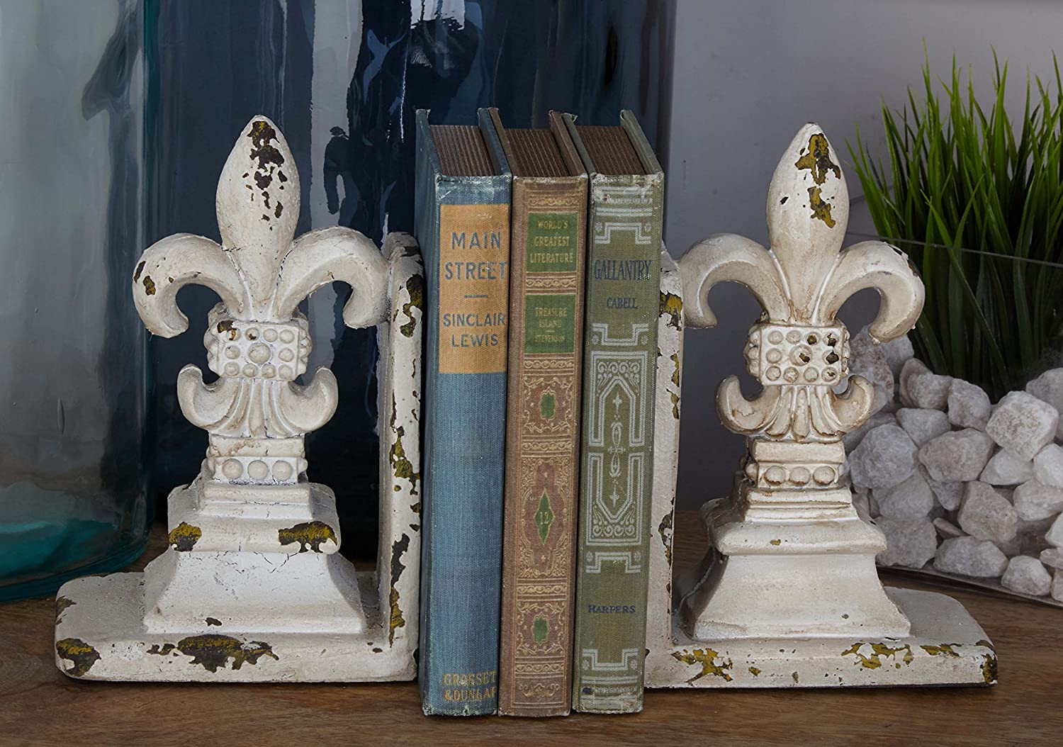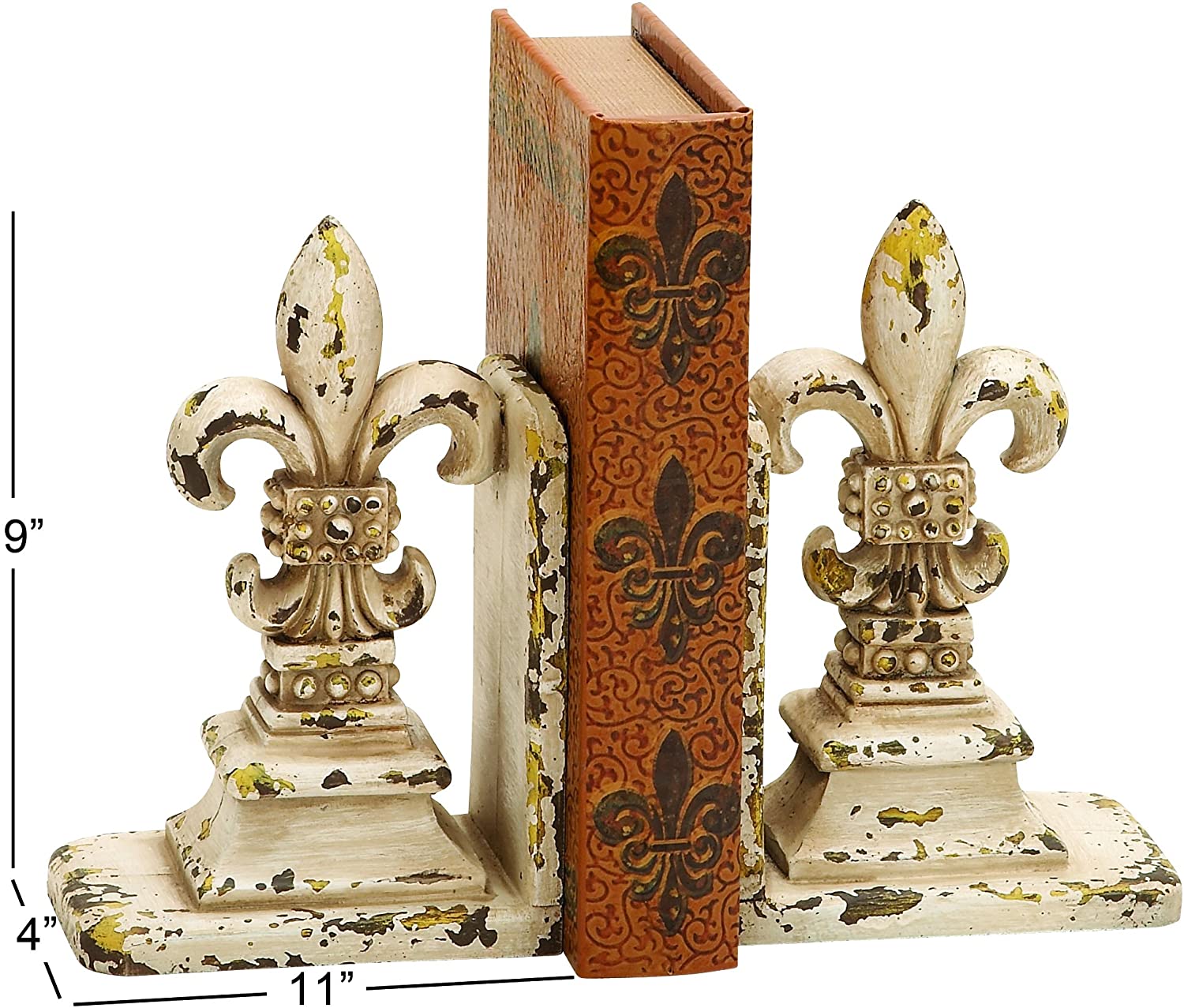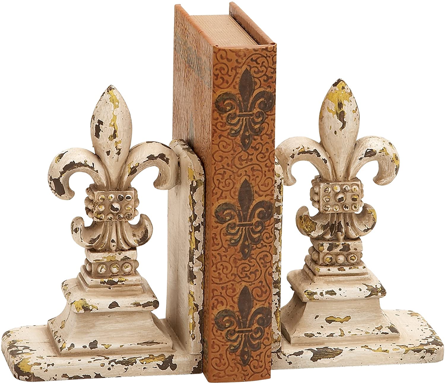 34844 polystone bookend pair is the latest arrival in reading- study room shelf decoration items category. Since its arrival, it is attracting the books lovers of all segments whether they are students, casual readers or book collectors. This bookend is designed with Fleur di Lis theme in shabby look. Each of two L- shape bookends with rectangular base plate has a beautiful flower sculpture made of quality polystone. World famous flower sculpture over elevated rectangular base is fixed over the horizontal panel. It inspires the kids to keep their books well managed. Fleur di Lis bookend is excellent complementary decor item for any home to bring the completeness in books shelf decor feel.