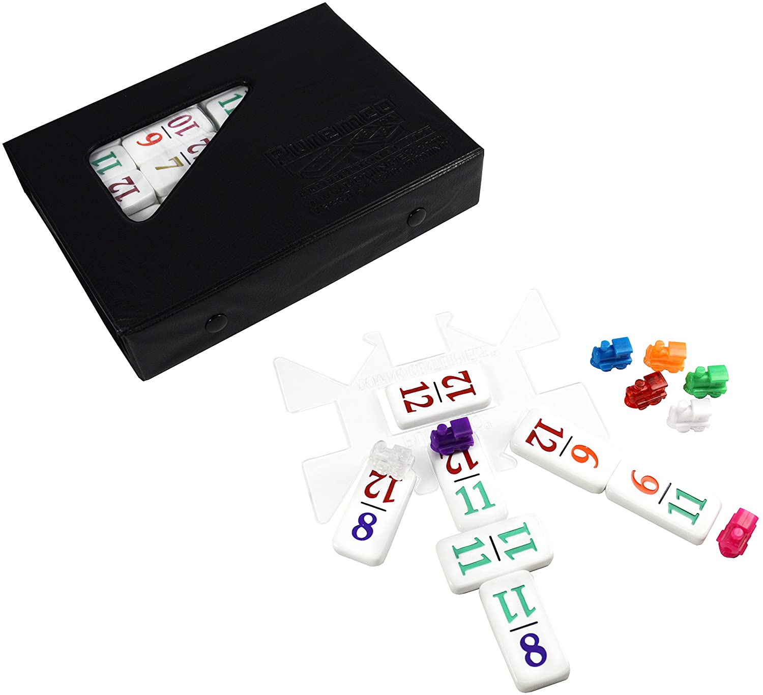 Puremco’s Number Dominoes ease the playing of all Double 6, 9 and 12 domino games by using large, color-coded, embossed numbers to replace the traditional dots. They are easier to count and tally scores at the end of each round. The large numbers also make for easier identification for those with weaker eyesight. Professional domino size: 1" x 2" x 3/8" thick. Cowhide Leatherette Case with Snap Closure. 91 Dominoes, Centerpiece, 8 Train Markers and Rules to 8 Games, including Chickenfoot and Mexican Train.
