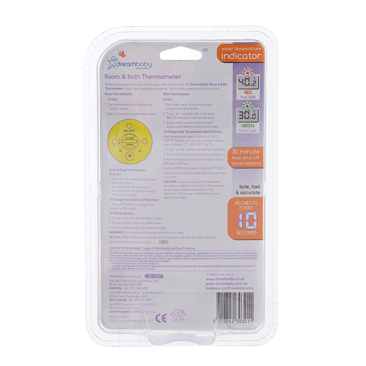 - BATTERIES INCLUDED – The Dreambaby Room & Bath Thermometer includes batteries so you can use it right out of the pack! In addition, it features a 30 minute automatic shut off to help preserve the battery lifespan. Don’t worry about getting the thermometer wet—it can be safely submerged in water, making it an adorable way to ensure bath time is less stressful and more enjoyable!