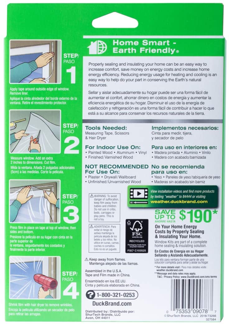 During the cold weather months, windows become a prime spot for energy loss. Duck Brand Shrink Film Window Kits create an added barrier between the outdoor air and the inside of your home, helping block drafts and air leaks that lead to high heating costs. Apply to the inside of your window to seal out the cold from getting into your home. Plus, it’s made with clear shrink film for good visibility and it’s easy to install and remove once the warmer weather arrives. Use together with other Duck Brand weatherization products to make your home more comfortable and energy efficient all year long. Tools needed: measuring tape, scissors, hair dryer