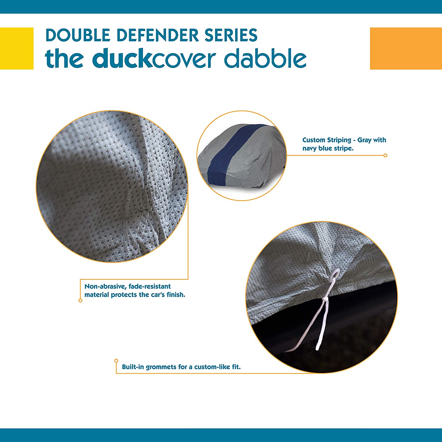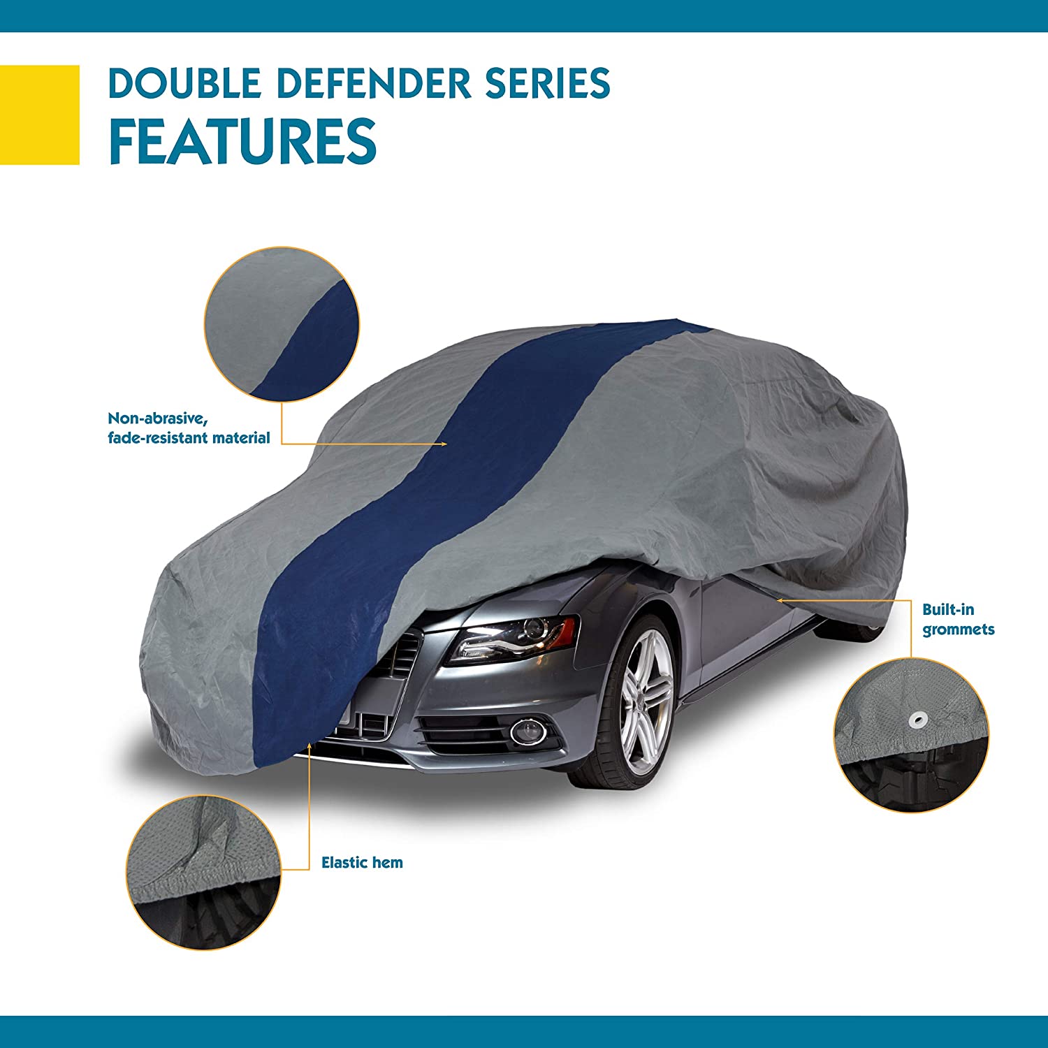 CAR COVERS: Duck Covers Double Defender semi-custom covers feature ultrasonically welded seams to improve water resistance, while UV treated material protects against prolonged exposure to heat. This car cover protects your car from dust, debris and scratches