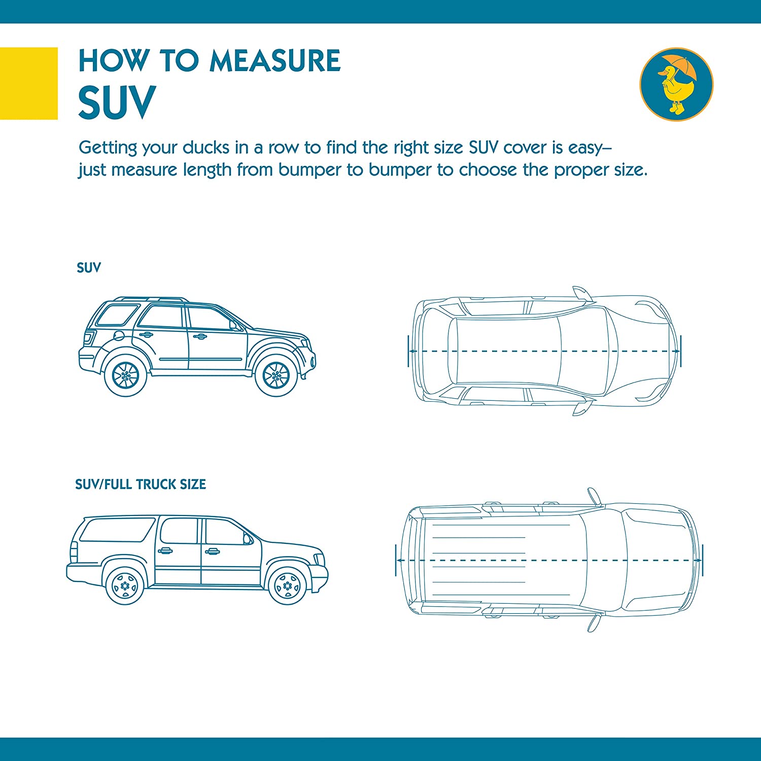 • ALL-WEATHER PROTECTION FOR YOUR SUV: Duck Weather Defender SUV cover is perfect for all-weather protection and storage for your SUV. Duck Covers Weather Defender semi-custom covers are made of a triple-layer water-resistant material that does not trap condensation, but allows condensation to escape through evaporation. The soft fabric of the SUV cover won't scratch the surface of your SUV. Cover for SUVs also comes with a storage bag for easy handling