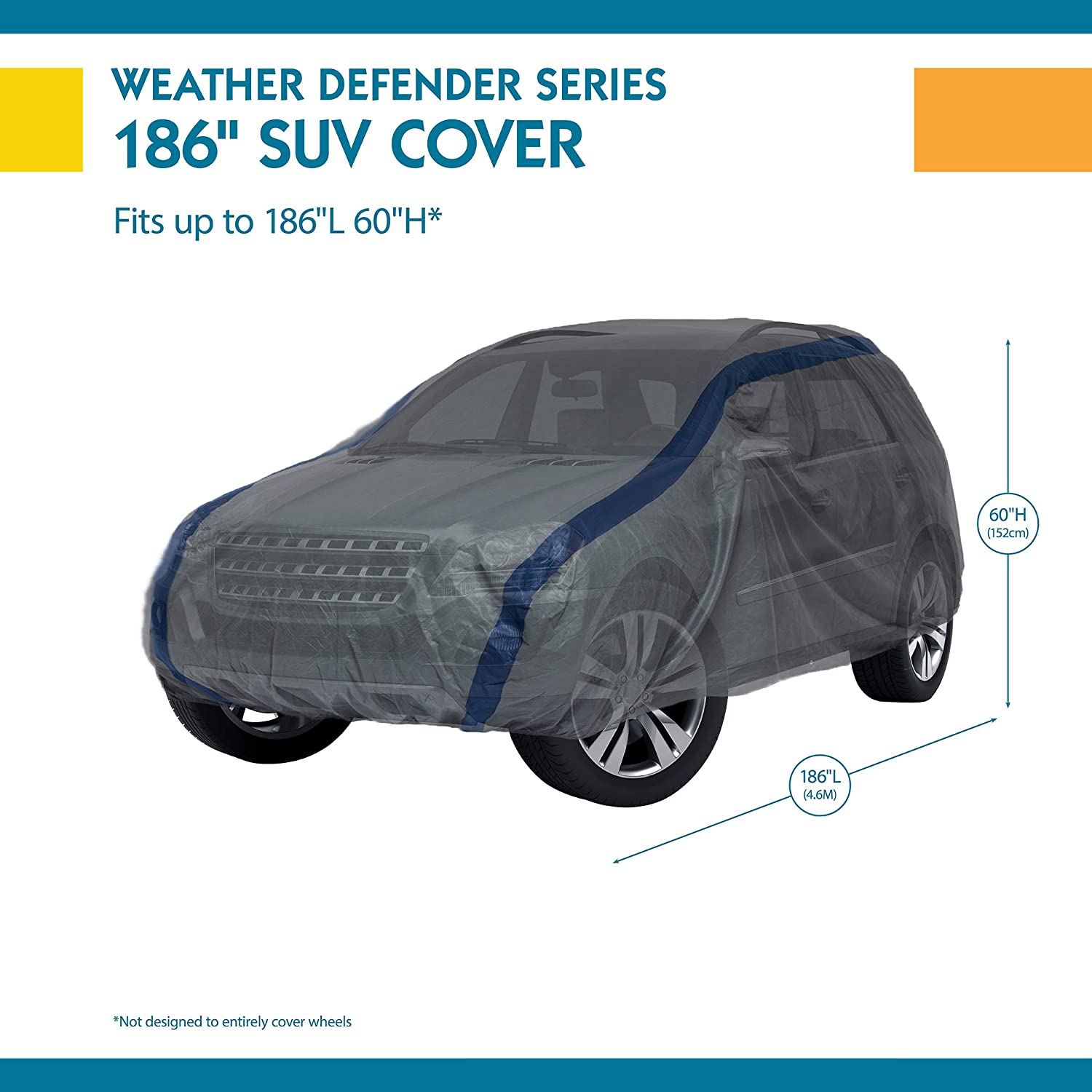 • SEMI-CUSTOM SUV COVER: Duck Weather Defender SUV cover fits SUVs up to 15 ft. 5 in. (186 in. L). This SUV cover also features an elastic hem for a secure, custom fit for your vehicle as well as non-scratch, tie-down grommets and rope