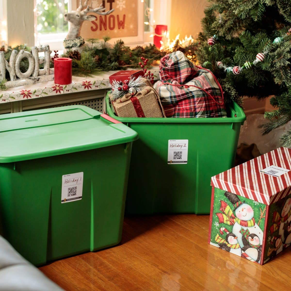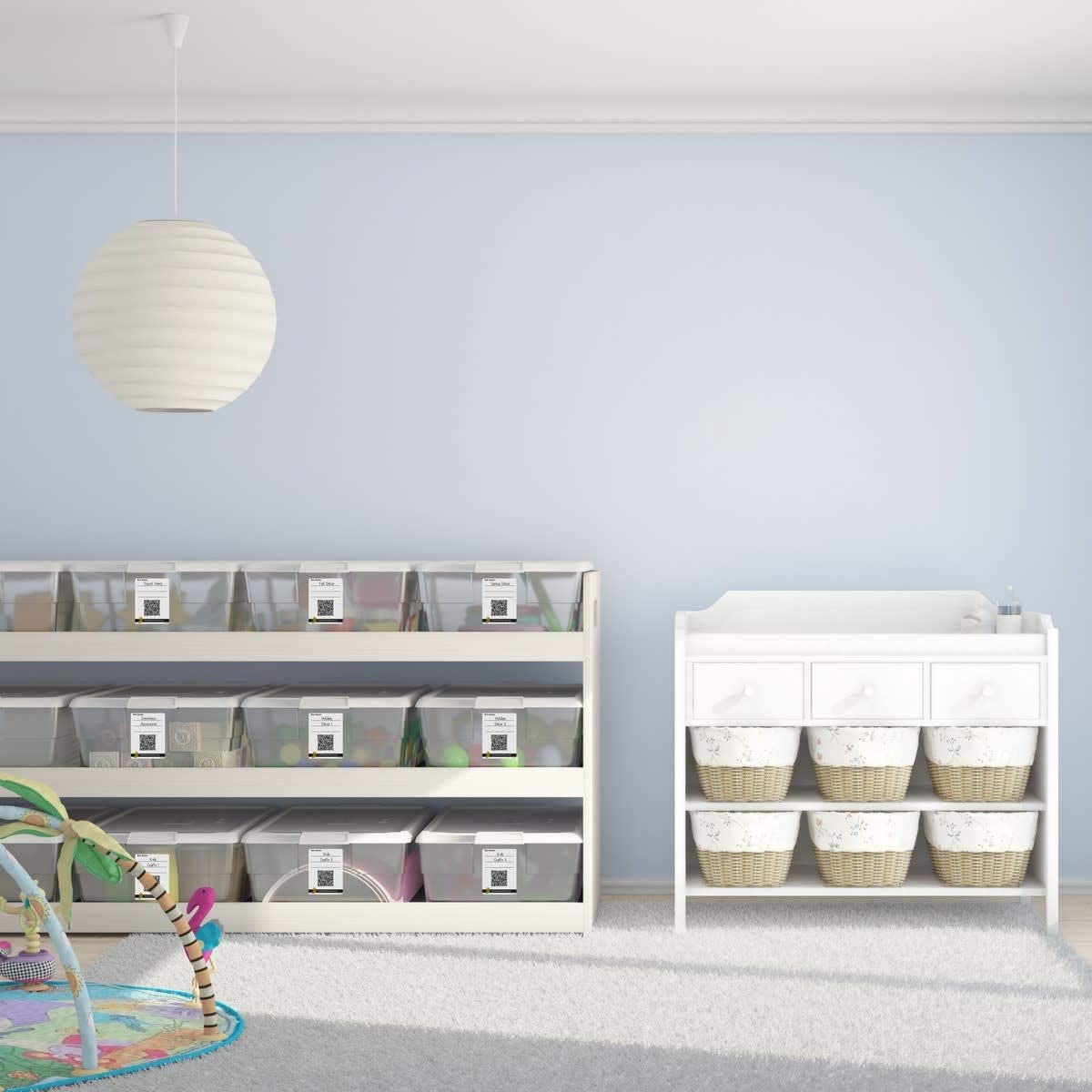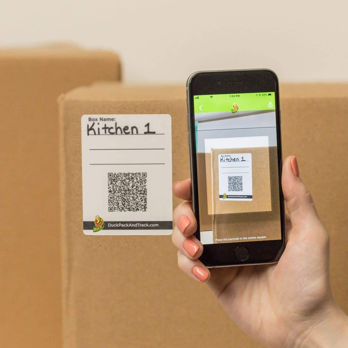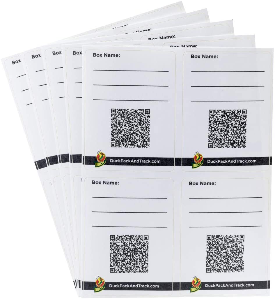 - Labels feature pre-printed QR code scannable with a smartphone and link to app with a writeable surface for labeling boxes