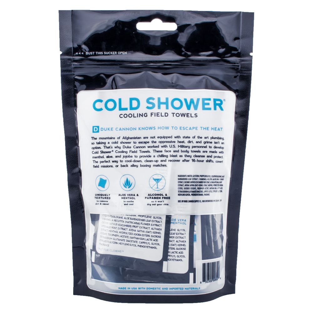 Duke Cannon Supply Co. Cold Shower Cooling Field Towels, 15 Pack - Individually Wrapped Face + Body Wipes: The mountains of Afghanistan are not exactly equipped with state of the art plumbing, so a cold shower to escape the dirt, grime, and oppressive heat was never an option. Such was the inspiration behind Cold Shower Cooling Field Towels. Developed in concert with our military advisory panel, these face and body towels are manufactured with menthol, aloe, and jojoba to provide a chilling blast as they cleanse and protect. The perfect way to cool down and recover after 12-hour shifts, covert field missions, or back alley boxing matches. Each pouch comes with 15 individually-wrapped towels, perfect for folks on the go. A Portion of Proceeds Benefits U.S. Veterans. Cruelty-Free. Made in the USA