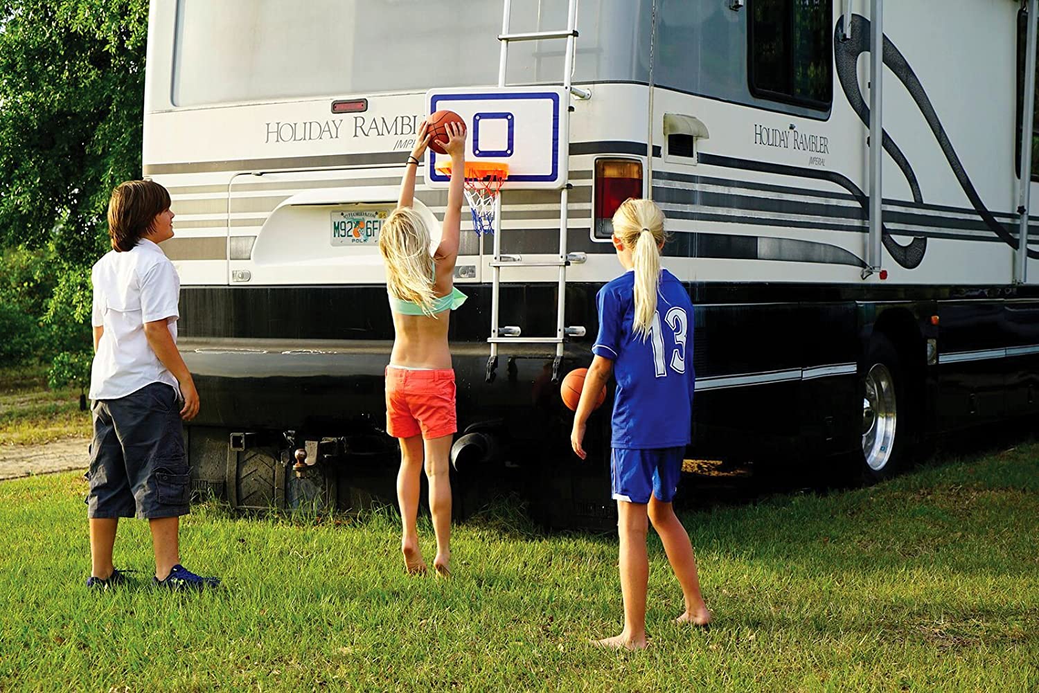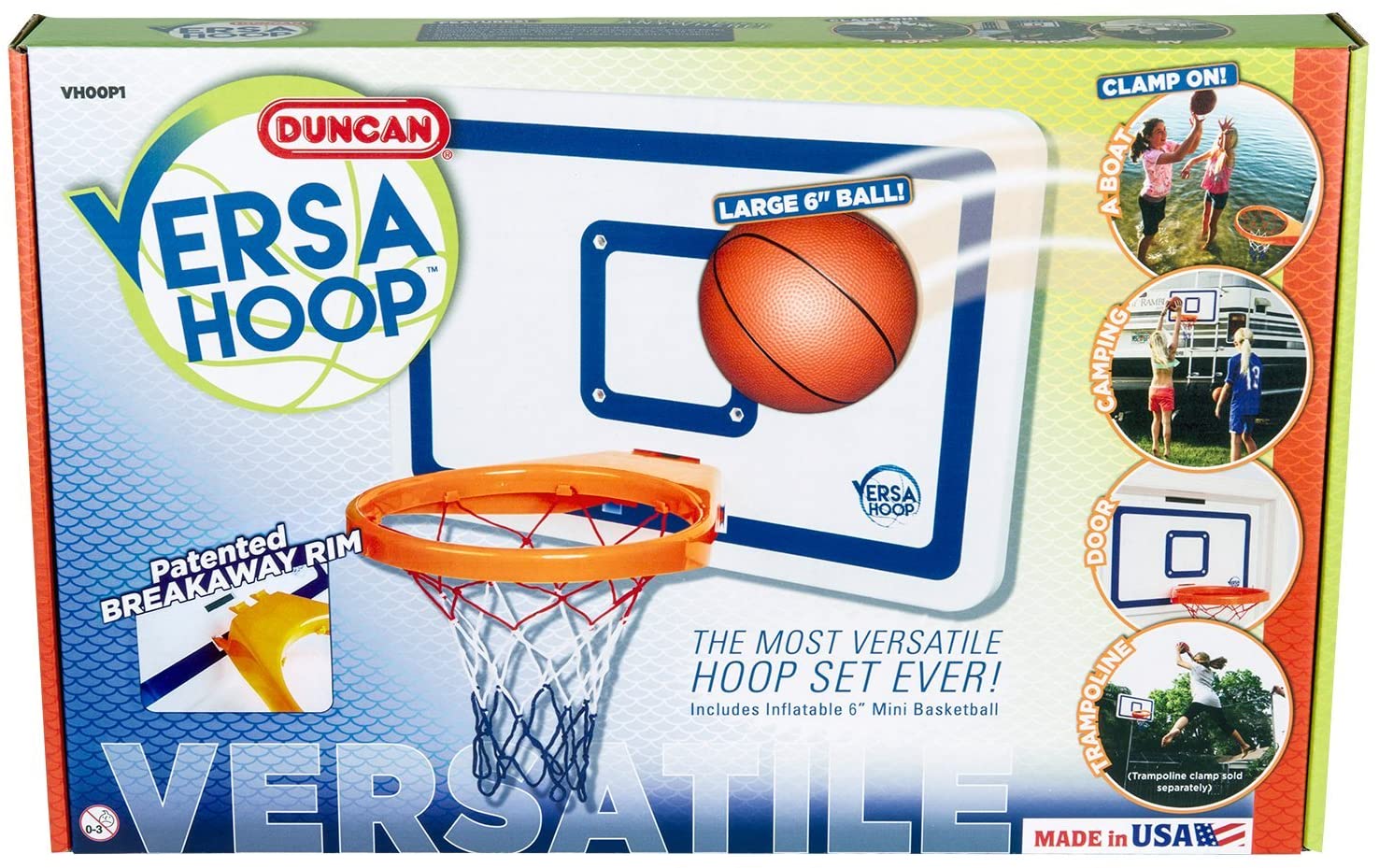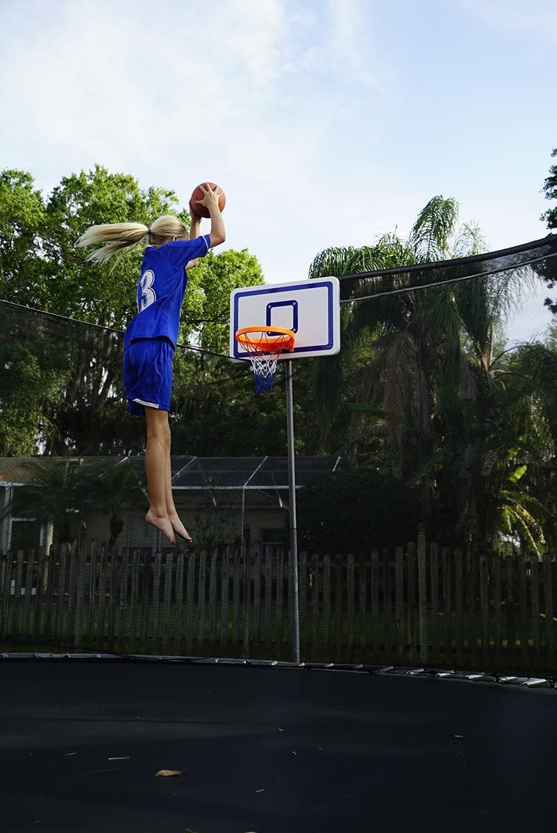 Duncan VersaHoop kit is a perfect indoor/outdoor basketball hoop set that allows your kids to indulge in playing basketball anytime anywhere. This kit includes oversized hoop, a durable ball, door hooks, and a clamp set. The durable construction of the backboard makes it impact resistant. The hooks and clamps make it easy to install or disassemble the setup, making it a portable hoop kit. You can mount it over different poles like a trampoline, pop-up tents, and RV ladders. Keep your kids busy and active with this new edition basketball hoop set up!