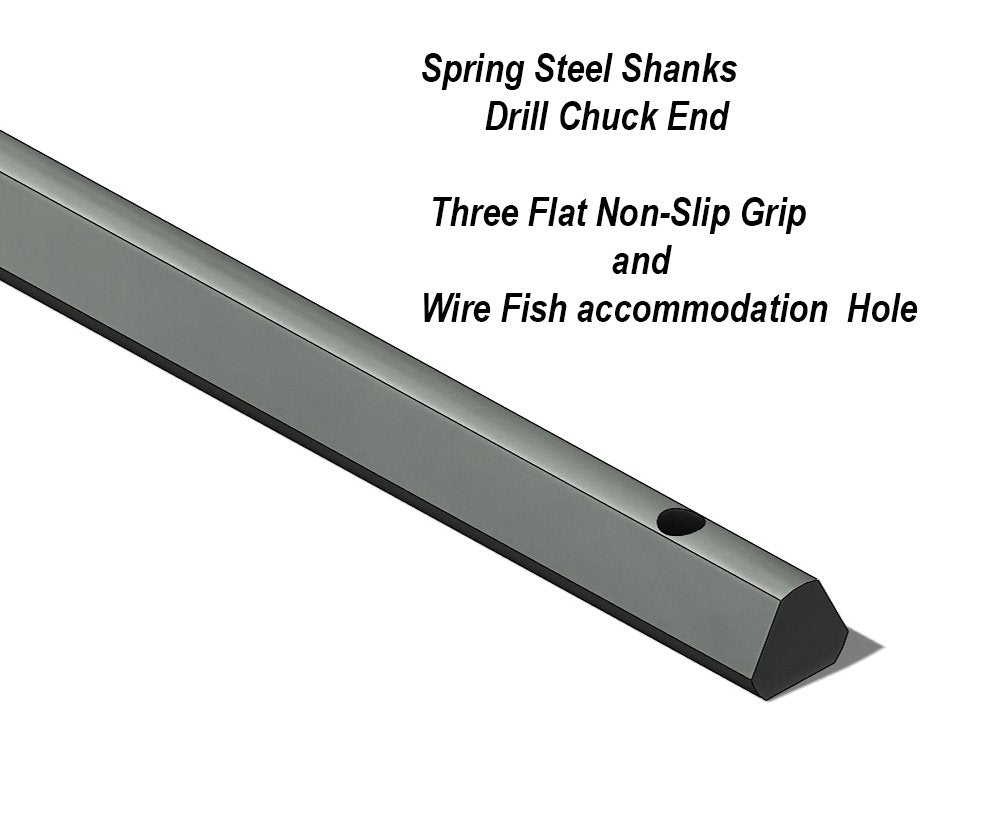 Eagle Tool auger style flex bit. This bit is best for all types of wood. Aggressive and self feeding auger point. Three flat non-slip grip on the chuck end. Flexible spring steel shank. Wire fishing accommodation holes in the head and shank. 3/4-inch head diameter, 1/4 inch shank diameter, and overall length is 54-inch.
